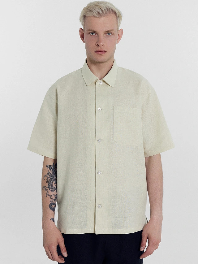 Стильная рубашка мужская прямого силуэта. Модель выполнена из премиального льна и натурального хлопка, длиной до середины бедер. Рукава короткие. Спереди застежка на петли и пуговицы, спинка с горизонтальной двойной кокеткой. Модная и комфортная рубашка — лучший выбор для жаркого лета. Вы можете носить ее как самостоятельный предмет гардероба, так и поверх футболок или маек.