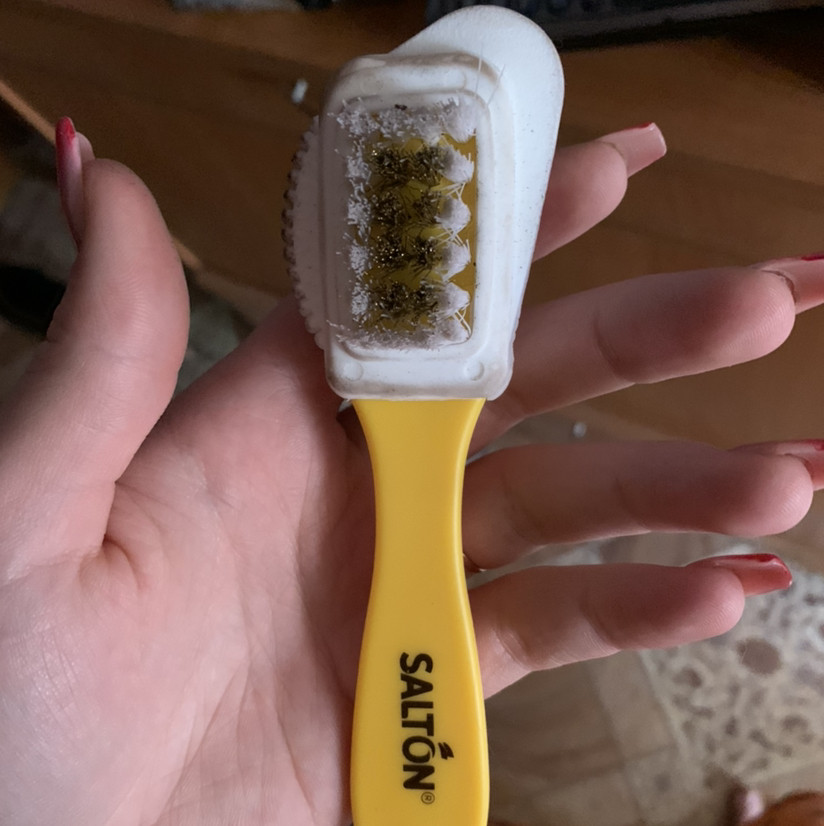 Хорошая щеточка. Хорошо чистит замшу и нубук. Рекомендую иметь дома 2 - для светлых и для темных вещей!