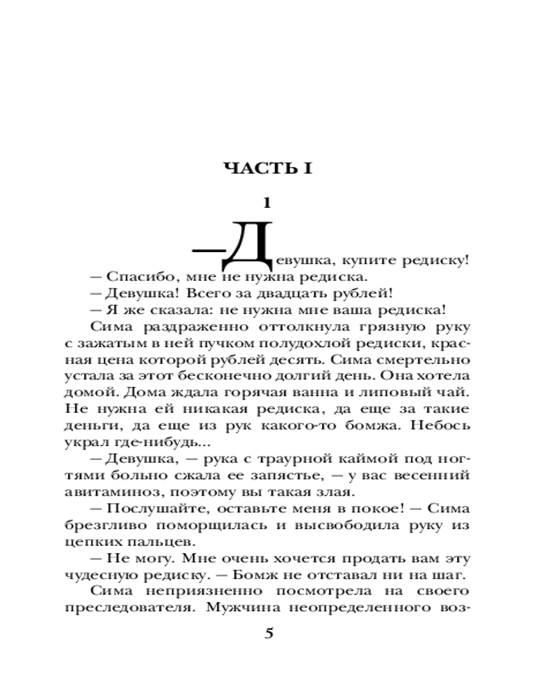 Серия: Татьяна Корсакова. Королева мистического романа. Новое оформление (обложка) «Девушка, купите редиску!» — окликнул Симу бомж. Он оказался настойчив, и она предпочла достать из кошелька последние деньги, лишь бы избавиться от неприятного типа. Могла ли Сима подумать, что перед ней — миллионер, участвующий в странной игре «Полное погружение». У богатых свои причуды, но порой их игры имеют самые непредсказуемые последствия. |