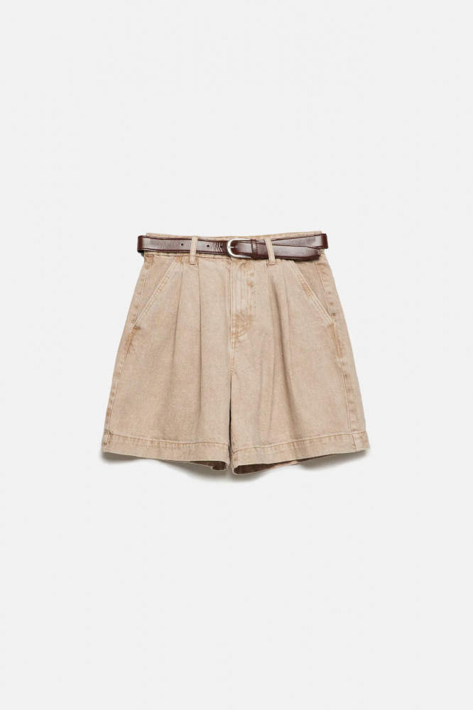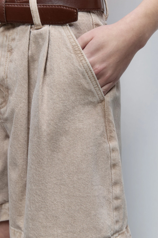 Короткие джинсовые шорты свободного кроя baggy fit из легкого, дышащего и очень приятного к телу хлопкового денима с вискозой. Высокая посадка по талии, выгодно подчеркивающая фигуру и скрывающая недостатки. Узкий ремень из гладкой искусственной кожи в комплекте. Застежка на молнию и пуговицу спереди, шлевки для ремня. Два боковых кармана с отрезным бочком, два накладных кармана сзади. Декоративные складки на поясе.
