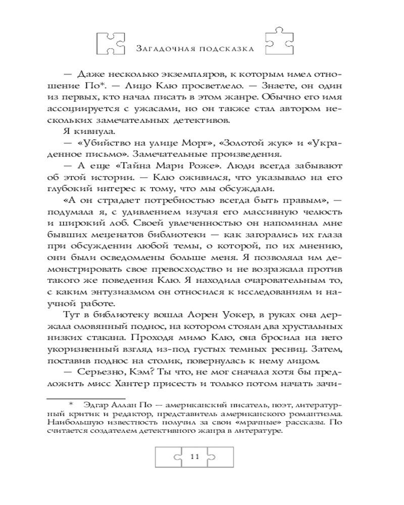 Она приходит в восторг, знакомясь с его последним приобретением — коллекцией, связанной с авторами классических детективов. Но восторг не длится долго, ведь скоро и самой Джейн придется примерить на себя образ мисс Марпл из книг Агаты Кристи: в поместье происходит убийство — где бы вы думали? — в библиотеке! Жертва — бывшая девушка мистера Клю, и теперь он — подозреваемый номер один. Кэмерон утверждает, что невиновен, и начинает собственное расследование, в котором принимает участие и Джейн. Вот только может ли она доверять своему новому боссу? |