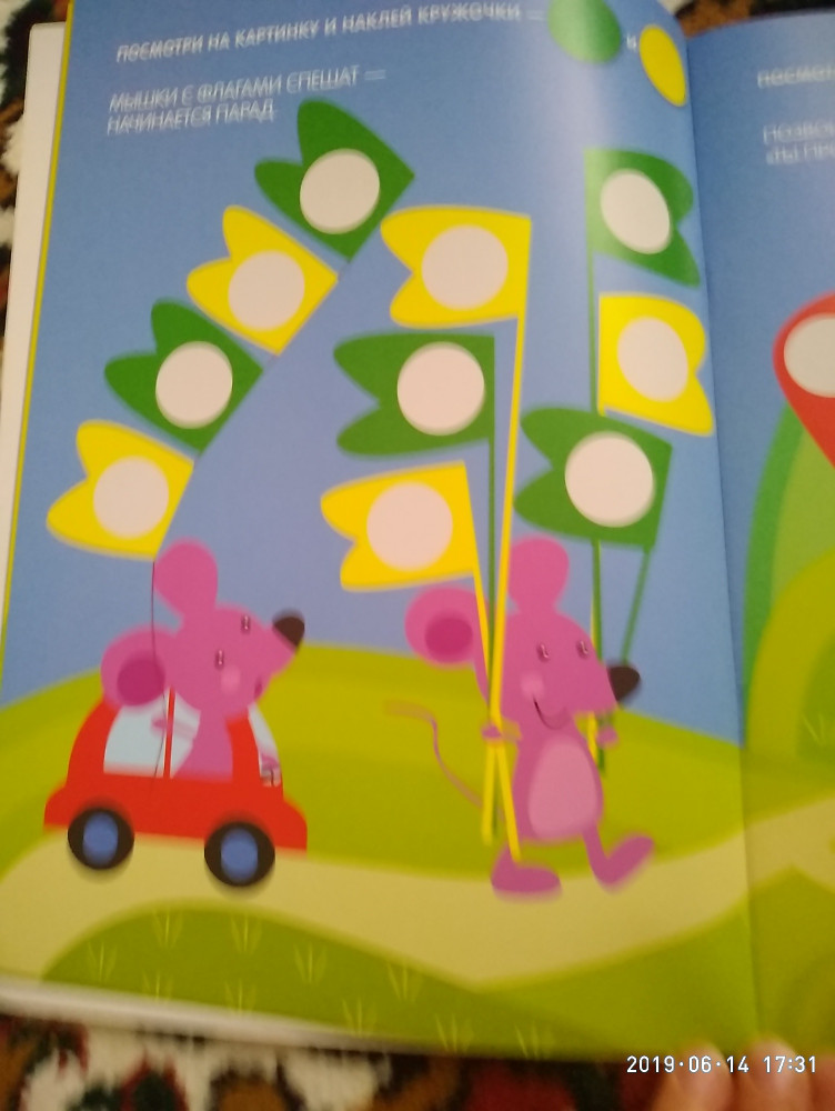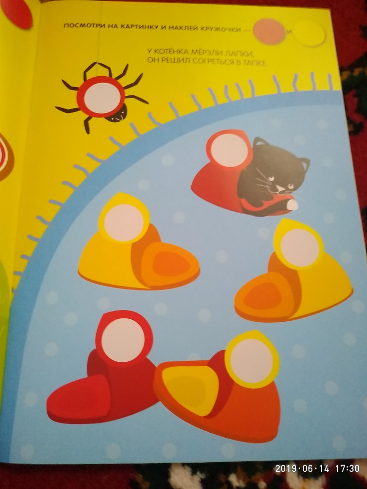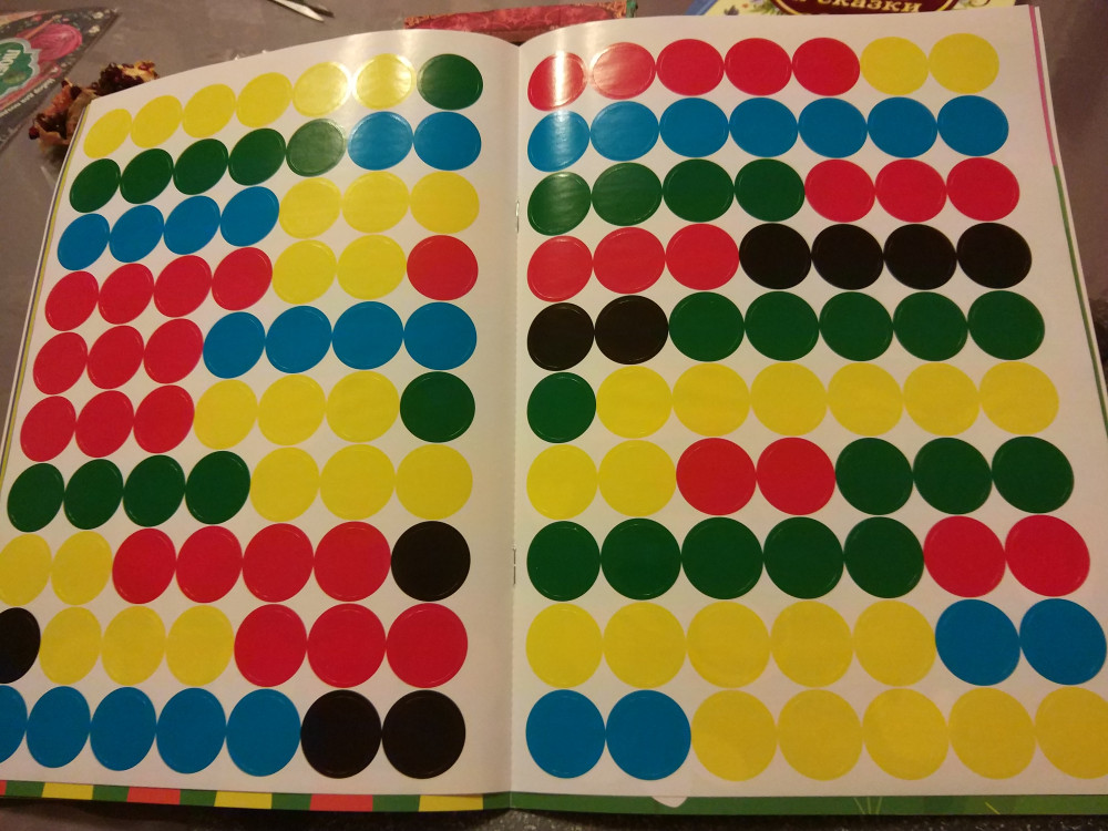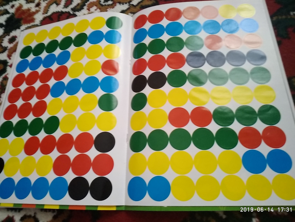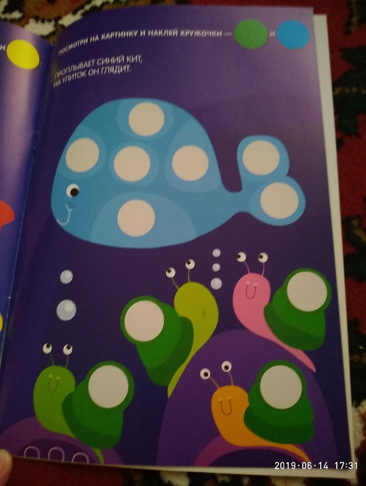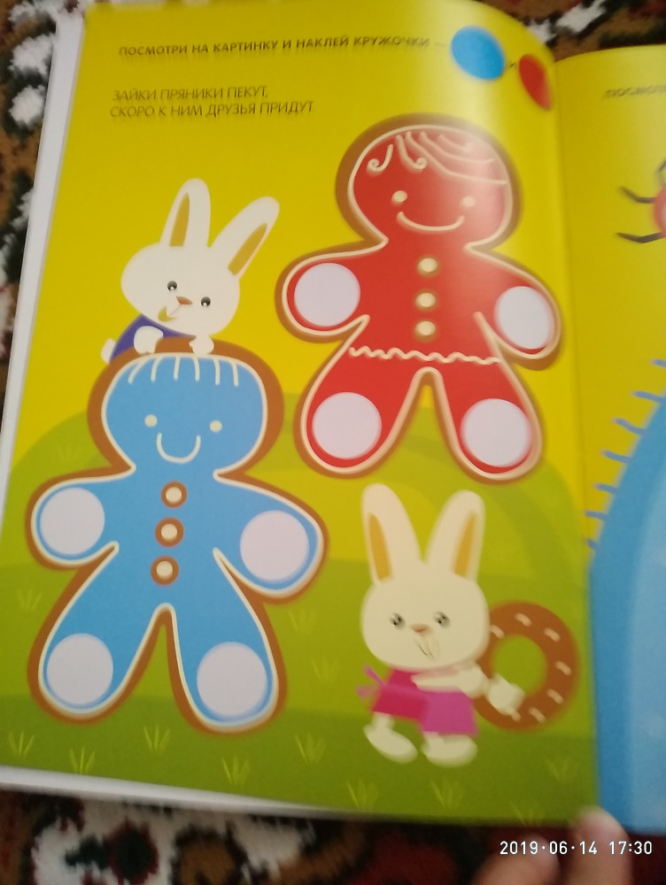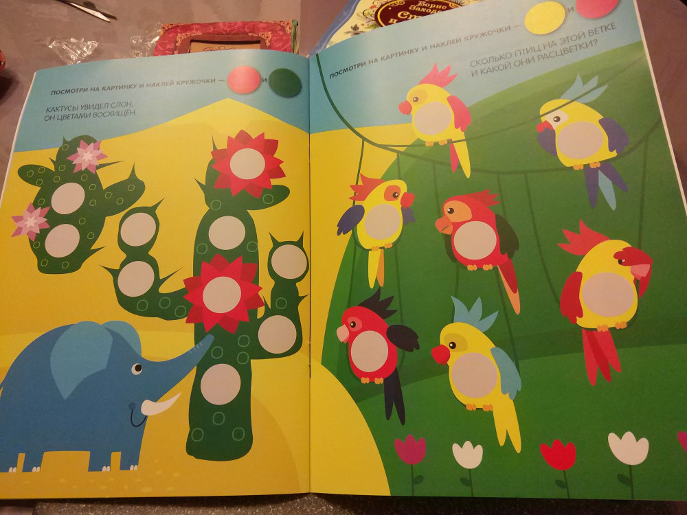 Дочке 1,5 года, с удовольствием клеит наклейки. Практикуем наклейки уже месяца 3. Когда не балуется, у неё получается приклеить практически идеально. Правда, последнее время у нас появилась такая фишка, сначала дочка приклеивает наклейки себе на руки, ноги, нос, лоб, бежит посмотреть в зеркало и только потом отлепляет и клеит наклейки в книгу. Покупаю уже не первую книгу из этой серии. В отличие от других книг с наклейками, в этой серии наклейки - только кружочки определённого цвета (никаких фигурок цветочков, бабочек, ромбиков, квадратов и т. д). Но зато книги этой серии обладают другими несомненными преимуществами: - книга достаточно большая (формат А4); - страницы и сами наклейки очень плотные; - наклейки достаточно большие, для маленьких детей очень удобно их брать/держать; - на каждой странице, к каждому рисунку идёт коротенький стишок.