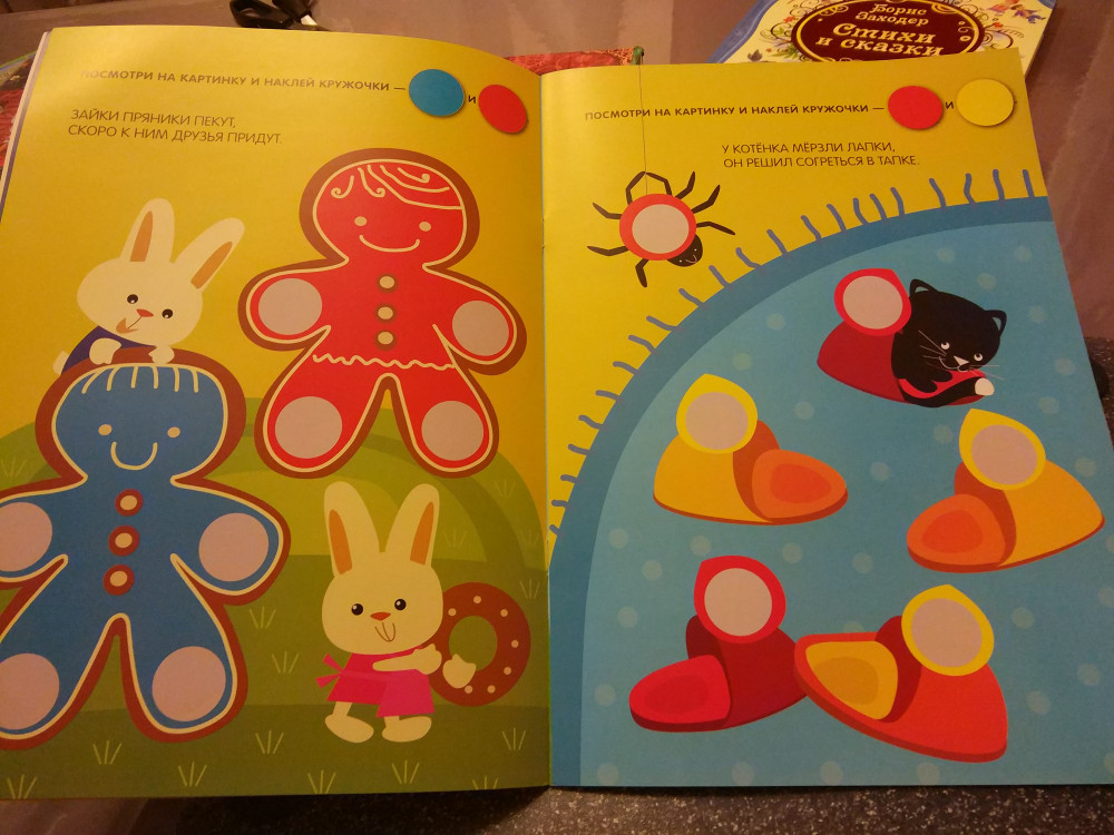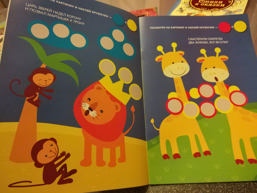 Лидия Отлично выполненная книжка-наклейка! Наклеек 140 - это очень хорошее количество. Картинки яркие и большие. Хорошо обозначены места, куда надо наклеивать кружочки. Рисунки весёлые. На каждой страничке - коротенькие стишки.