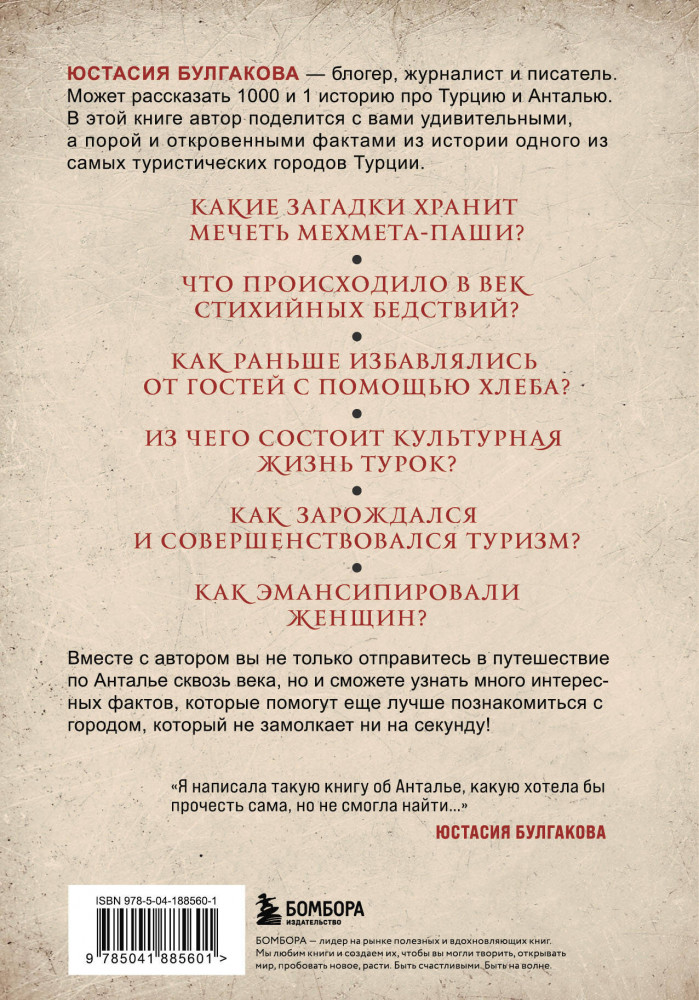 💳 Оплатить за товар можно при получении 🇰🇿 Есть бесплатная доставка по Казахстану 🎁 Копите бонусы с каждой покупки Серия: Путешествия по культурам мира Юстасия Булгакова — блогер, журналист и писатель. Может рассказать 1000 и 1 историю про Турцию и Анталью. В этой книге автор поделится с вами удивительными, а порой и откровенными фактами из истории одного из самых туристических городов Турции. Вместе с автором вы не только отправитесь в путешествие по Анталье сквозь века, но и сможете узнать много интересных фактов, которые помогут еще лучше познакомиться с городом, который не замолкает ни на секунду! |