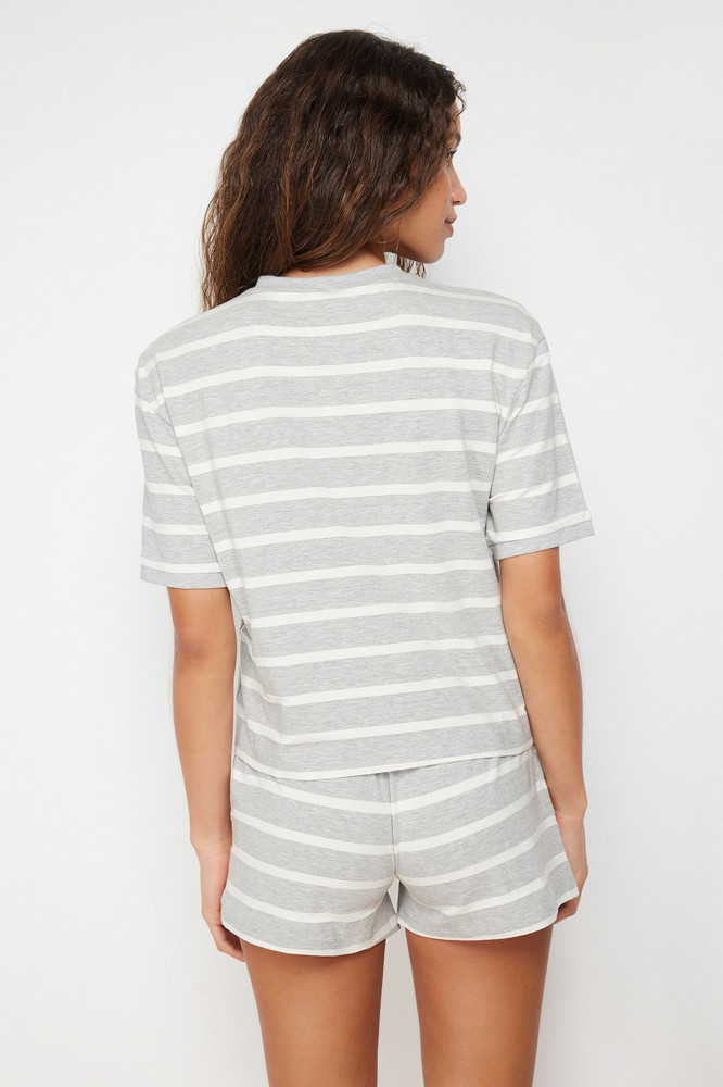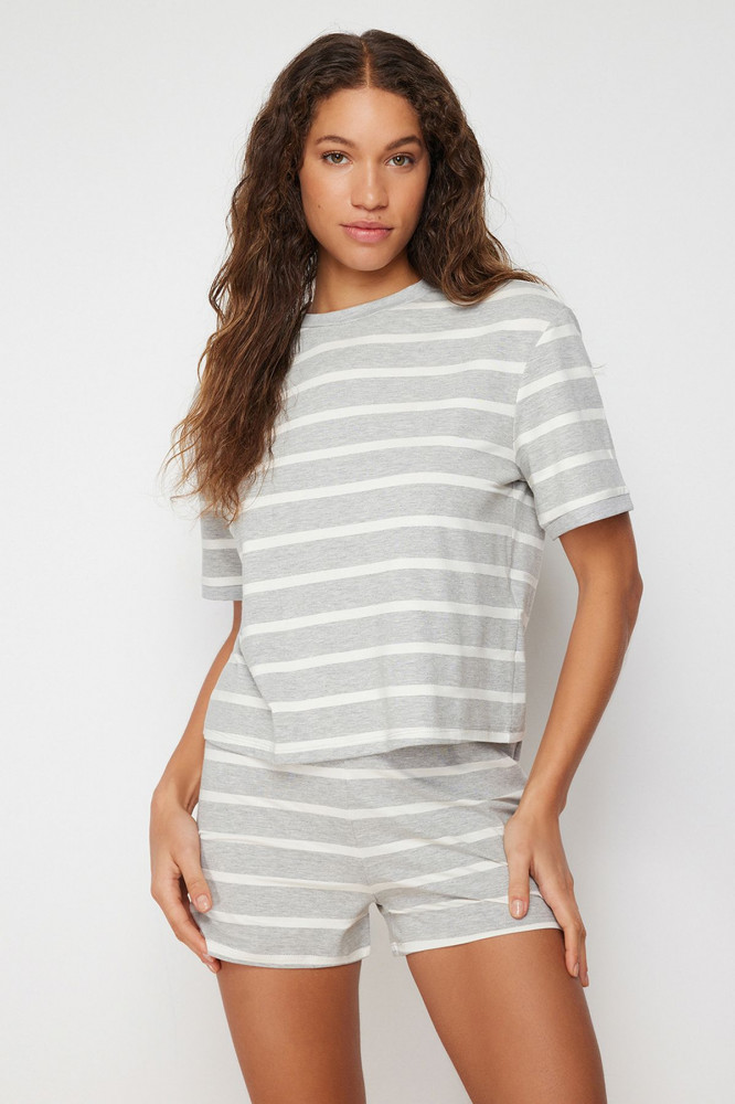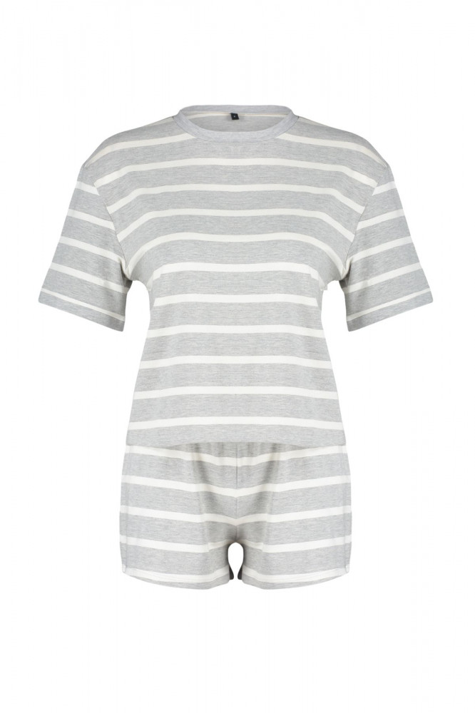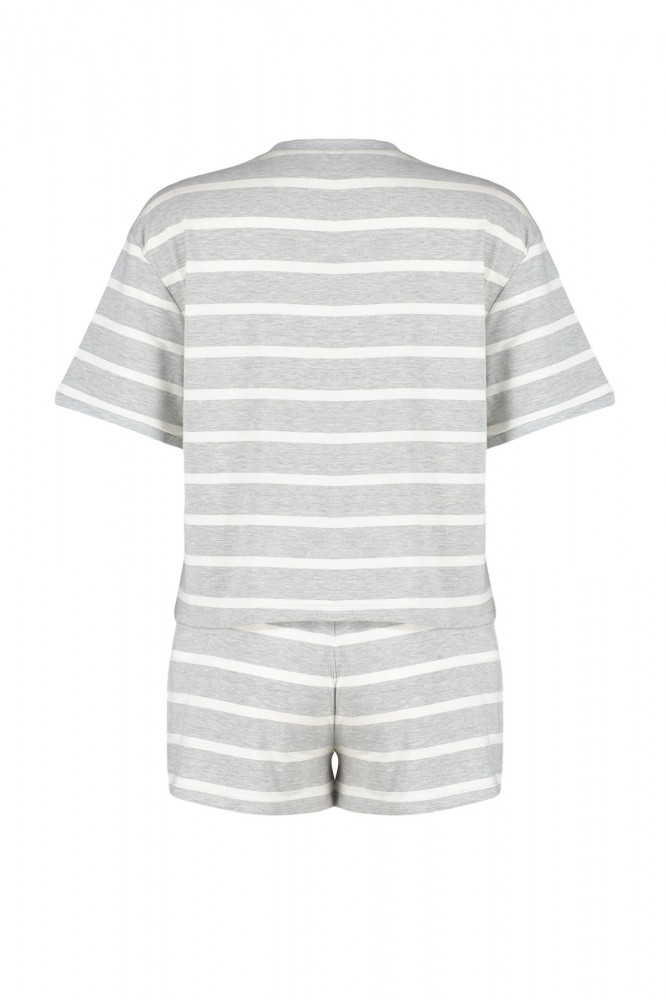 Информация о модели: Размеры модели: Рост: 175 см (5'9"), Обхват груди: 86 см (33 дюйма), Обхват талии: 61 см (24 дюйма), обхват бедер: 86 см (33 дюйма); Размер изделия на манекене S / 36 / 8.; Состав материала: 35% полиэстер, 34% хлопок, 26% вискоза, 4% эластан, 1% полиамид; Тип ткани: трикотажная; Изделие состоит из 2 частей: верхней и нижней.; Оно выглядит комфортно и стильно благодаря мягкой структуре ткани, изготовленной из серебристой пряжи. Изделие включает в себя одну пижамную рубашку и один пижамный низ. Благодаря удобному рисунку его удобно использовать дома. Пожалуйста, следуйте приведенным ниже инструкциям по стирке, чтобы вы могли использовать ваше изделие в течение более длительного времени и должным образом ухаживать за ним. ; Цвета могут отличаться на студийных снимках из-за разницы в освещении.