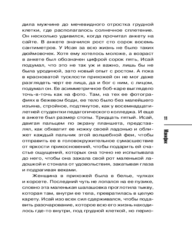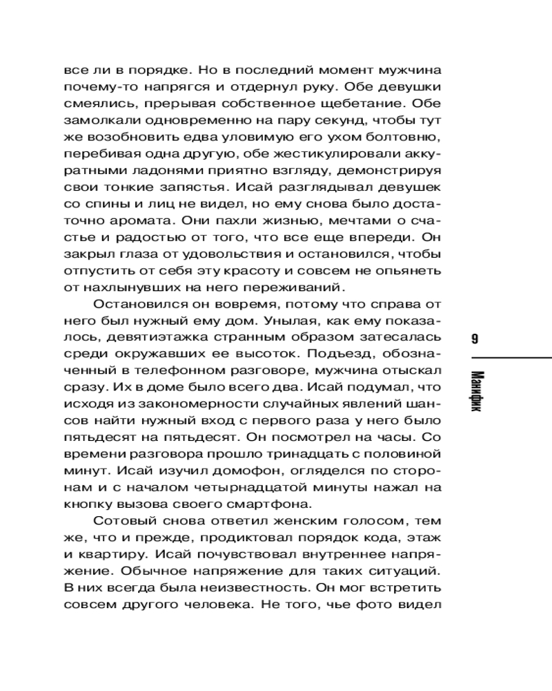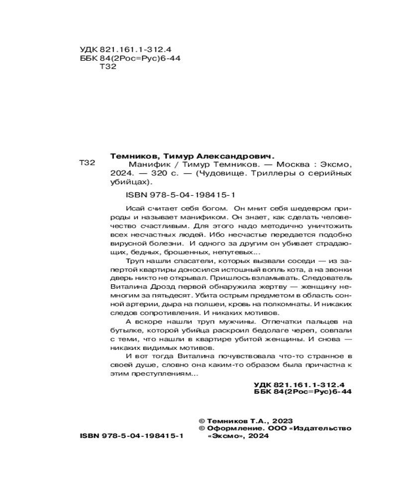 Исай считает себя богом. Он мнит себя шедевром природы и называет манификом. Он знает, как сделать человечество счастливым. Для этого надо методично уничтожить всех несчастных людей. Ибо несчастье передается подобно вирусной болезни. И одного за другим он убивает страдающих, бедных, брошенных, непутевых... Труп нашли спасатели, которых вызвали соседи, — из запертой квартиры доносился истошный вопль кота, а на звонки в дверь никто не открывал. Пришлось взламывать. Следователь Виталина Дрозд первой обнаружила жертву — женщину, немногим за пятьдесят. Убита острым предметом в область сонной артерии, дыра на полшеи, кровь на полкомнаты. И никаких следов сопротивления. И, главное — никаких мотивов. А вскоре наши труп мужчины. Отпечатки пальцев на бутылке, которой убийца раскроил бедолаге череп, совпали с теми, что нашли в квартире убитой женщины. И снова — никаких видимых мотивов. И вот тогда Виталина почувствовала что-то странное в своей душе, словно она каким-то образом была причастна к этим преступлениям... |