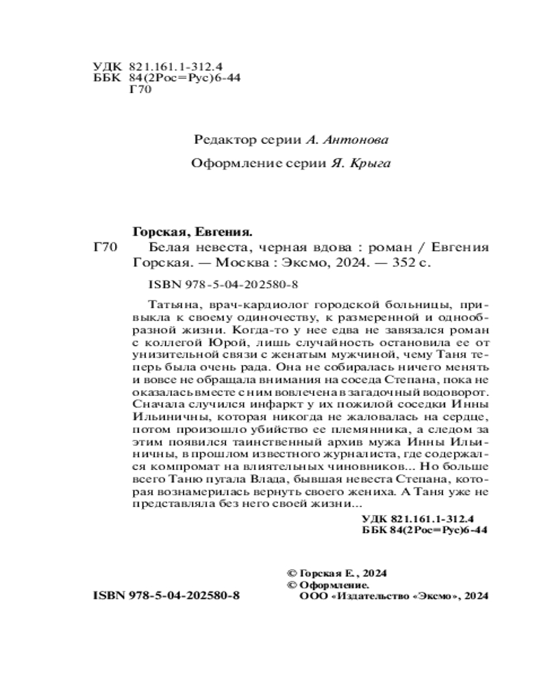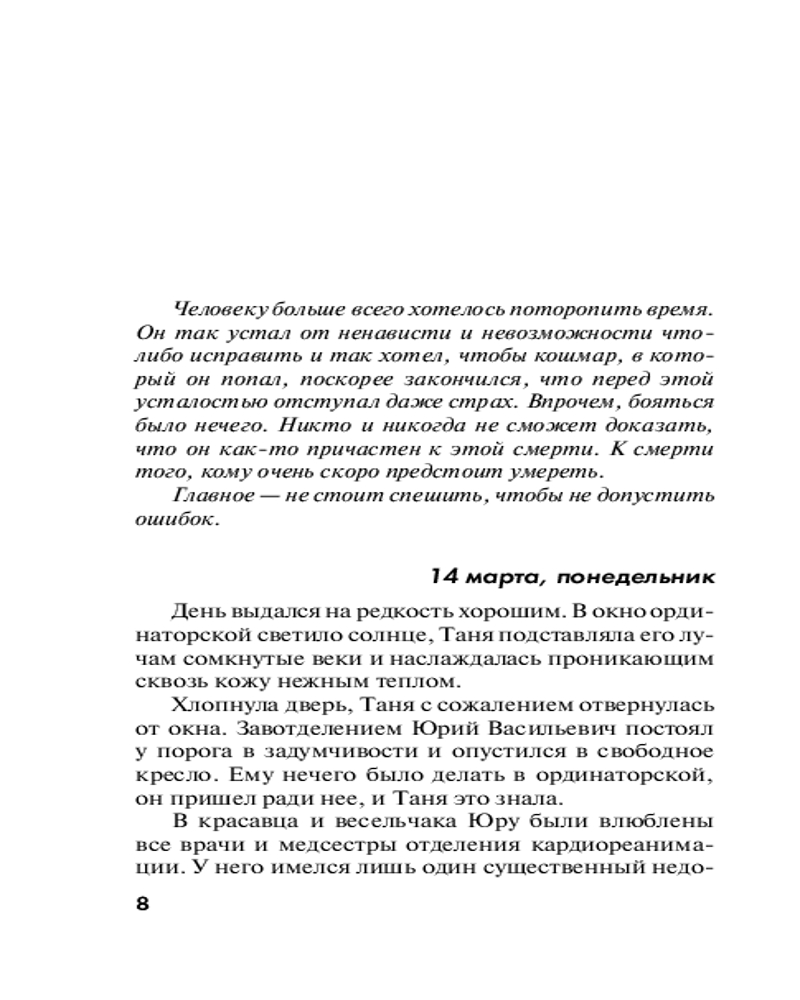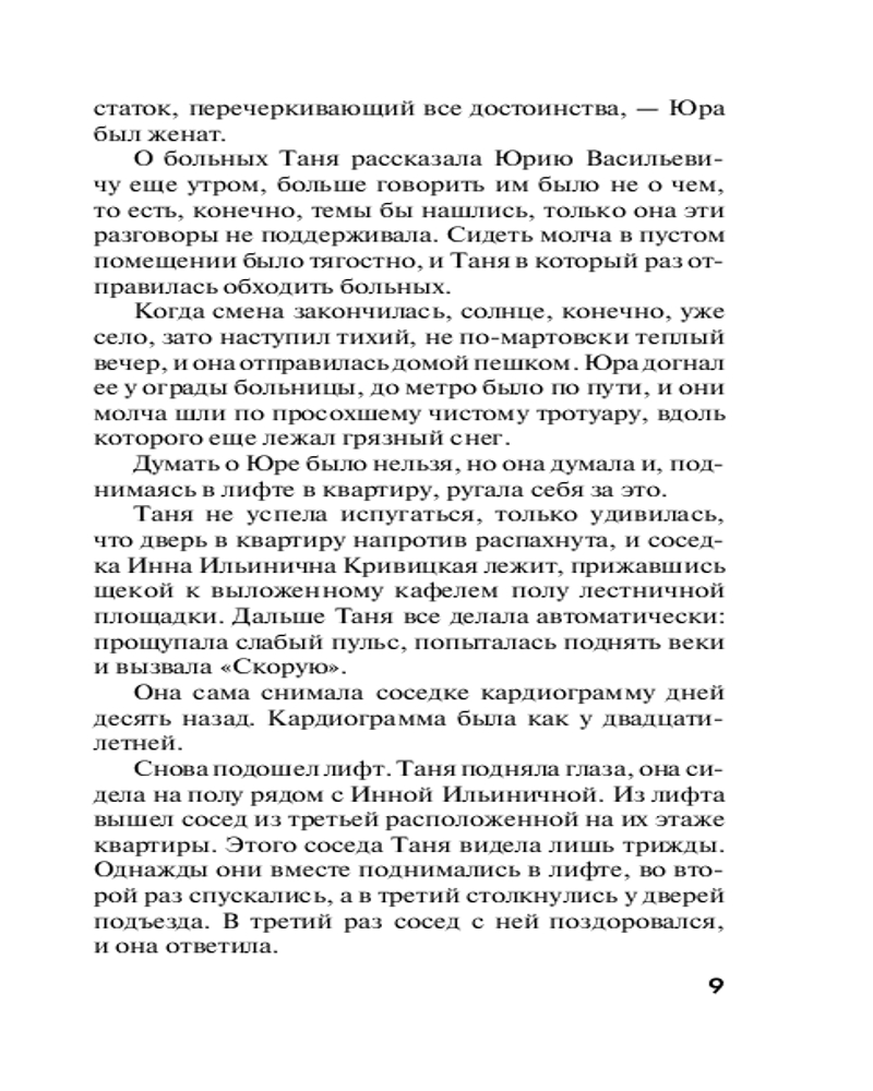 Серия: Столичный детектив. Новое оформление (обложка) Татьяна, врач-кардиолог городской больницы, привыкла к своему одиночеству, к размеренной и однообразной жизни. Когда-то у нее едва не завязался роман с коллегой Юрой, лишь случайность остановила ее от унизительной связи с женатым мужчиной, чему Таня теперь была очень рада. Она не собиралась ничего менять и вовсе не обращала внимания на соседа Степана, пока не оказалась вместе с ним вовлечена в загадочный водоворот. Сначала случился инфаркт у их пожилой соседки Инны Ильиничны, которая никогда не жаловалась на сердце, потом произошло убийство ее племянника, а следом за этим появился таинственный архив мужа Инны Ильиничны, в прошлом известного журналиста, где содержался компромат на влиятельных чиновников... Но больше всего Таню пугала Влада, бывшая невеста Степана, которая вознамерилась вернуть своего жениха. А Таня уже не представляла без него своей жизни... |