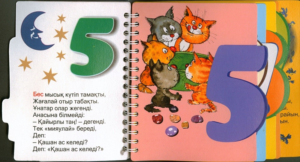 Әр бетінде санға байланысты сурет бейнеленген. Жанында тақпағы бар. Аруна кітаптарын ұнатамыз. Менің қызым 1 жастан асты, біз жай ғана суреттерін қарап, кітап ақтарып отырамыз. Ол суреттердегі бейнелердің аттарын әлден жаттап алды. Сондықтан балаңызға 3 жастан ерте де алуға болады.
