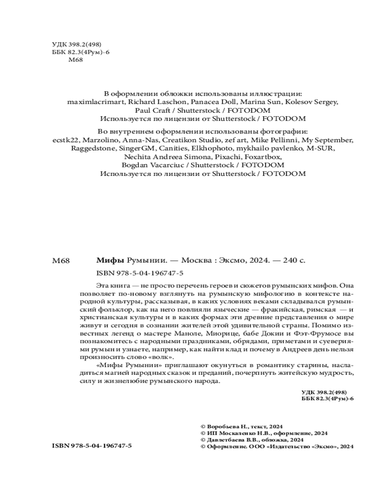 💳 Оплатить за товар можно при получении 🇰🇿 Есть бесплатная доставка по Казахстану 🎁 Копите бонусы с каждой покупки Серия: Мифы мира. Самые сказочные истории человечества Рассказы о вампирах есть в мифологиях многих народов, но именно Румыния подарила миру самого запоминающегося героя этого жанра. Благодаря ирландцу Брэму Стокеру из сурового полководца времен Средневековья граф Дракула превратился в аристократичного убийцу, и таким его узнал весь мир: киноиндустрия создала целую галерею харизматичных кровопийц от Кристофера Ли и Гэри Олдмана до Тома Круза и Роберта Паттинсона. Но кем был настоящий Дракула и при чем здесь румынская мифология и народные суеверия? Почему плохо родиться во вторник и в какой день нельзя выходить из дома, чтобы тебя не похитил стригой? Почему молния никогда не поражает левшей? Как стать учеником колдуна и что за это будет? На эти и другие вопросы вы найдете ответы на страницах этой книги, а цветные и черно-белые иллюстрации, QR-коды, ведущие на страницы музеев и энциклопедий, дополнят погружение в удивительную мифологию, легенды и народные поверья Румынии! |