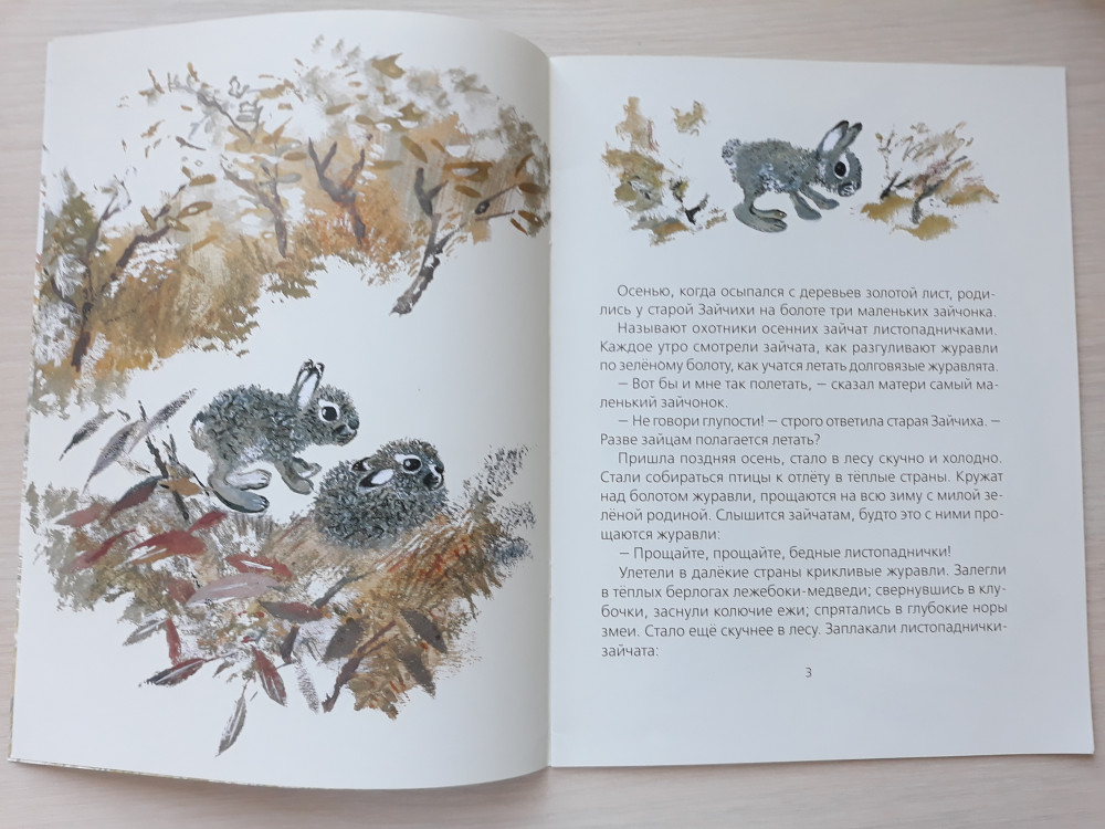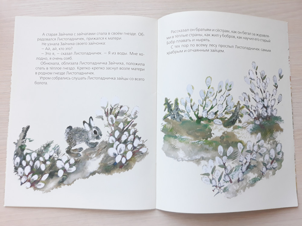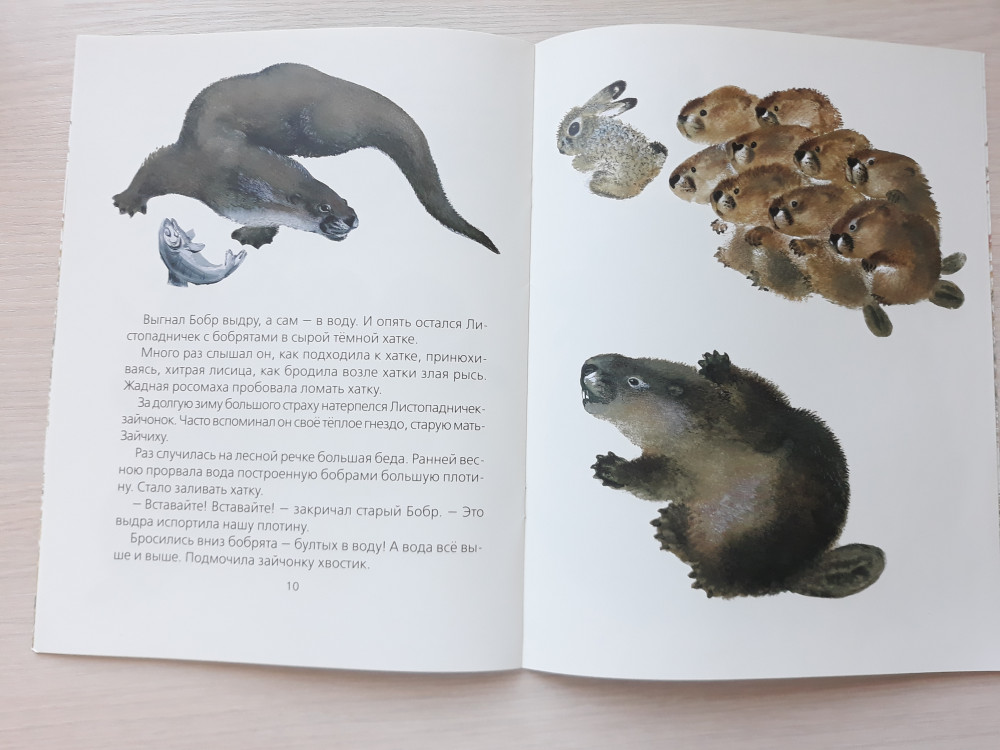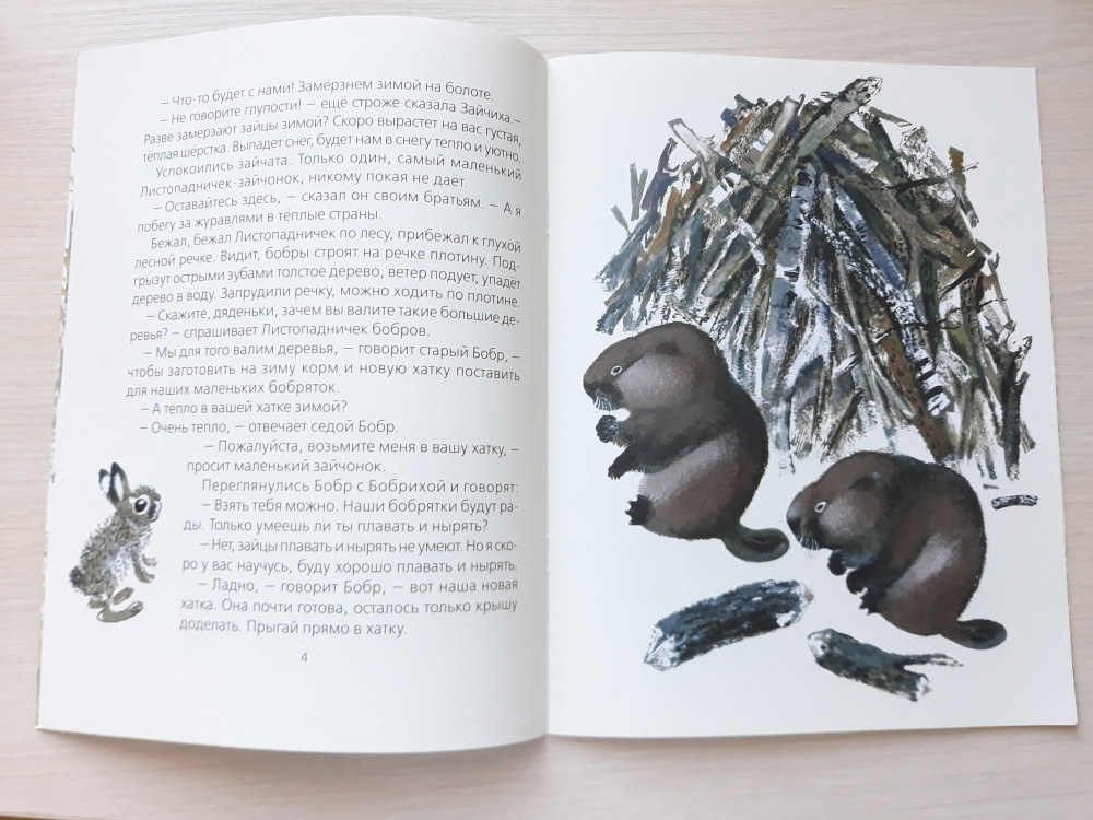 Очаровательная качественная книжечка за небольшие деньги! Очень добрая история о маленьком зайчонке - Листопадничке, который осенью убежал из дома в поисках защиты от холода и перезимовал с бобрами) А весной вернулся домой, к маме!) Текст читается легко, ровно, написан красивым языком. Книга большого размера, тонкая глянцевая обложка, внутри тонированные в теплый бежевый цвет мелованные странички. Рисунки Евгения Чарушина очень хороши - зайчик прям такой милый и пушистенький получился! А еще на страницах ждут бобры и выдра! Шрифт крупный, подойдет деткам для самостоятельно чтения. Но в книге есть 1 опечатка - вместо слова "покоя" - "покая"(((