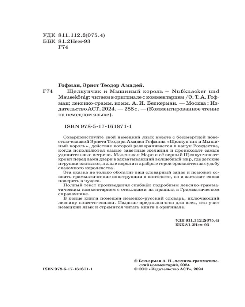 Серия: Комментированное чтение на немецком языке Лучший способ учить иностранный язык — это читать художественное произведение, постепенно овладевая лексикой и грамматикой. Совершенствуйте свой немецкий язык вместе с бессмертной повестью-сказкой Эрнста Теодора Амадея Гофмана «Щелкунчик и Мышиный король», действие которой разворачивается в канун Рождества, когда исполняются самые заветные желания и происходят самые удивительные встречи. Маленькая Мари и её верный Щелкунчик откроют перед вами двери в захватывающий волшебный мир, где детские игрушки оживают, а злые короли и храбрые герои сражаются за судьбу сказочного королевства. Эта сказка не только обогатит ваш словарный запас и поможет освоить грамматические конструкции в контексте, но и заставит снова поверить в чудеса. Полный текст произведения снабжён подробным лексико-грамматическим комментарием с отсылками на правила в Грамматическом справочнике. В конце книги помещён немецко-русский словарь, включающий лексику повести-сказки. Издание предназначено для всех, кто учит немецкий язык и стремится читать книги в оригинале. |