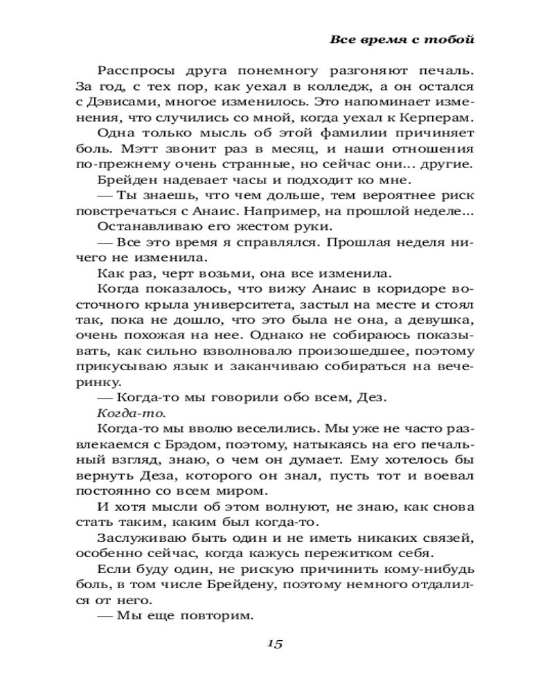 Серия: Клуб романтики Что мешает сердцу разбиться на тысячу кусочков? Я пытаюсь это забыть, и все же знаю, что боль будет возвращаться, сердце навсегда останется в шрамах. Прошло некоторое время со дня аварии, которая положила конец истории любви Дезмонда и Анаис. С тех пор он делает все, чтобы больше не видеться с ней. Вместе с их любовью он отодвинул в угол и свой энтузиазм по поводу будущего: теперь он живет пьяными вечеринками и ночами, проведенными в объятиях случайных девушек. Как будто их было достаточно, чтобы заставить забыть половину своей души. Анаис также изо всех сил пытается жить дальше. Теперь она переехала в университетский кампус, но, потеряв Деза, она знает, что потеряла лучшую часть себя. И как бы она ни старалась, ее память все еще достаточно сильна, чтобы забыть все, что было. Но однажды вечером происходит неизбежное, Дез и Ана снова встречаются. И их сердца, слишком долго молчавшие, взрываются. |