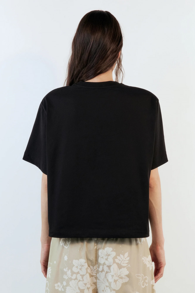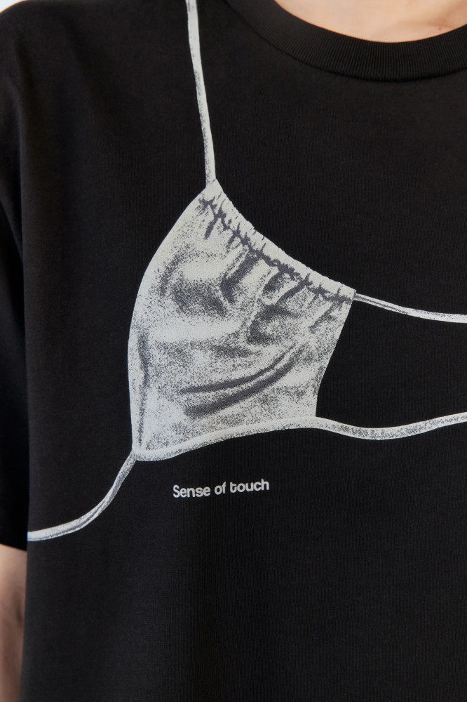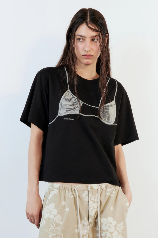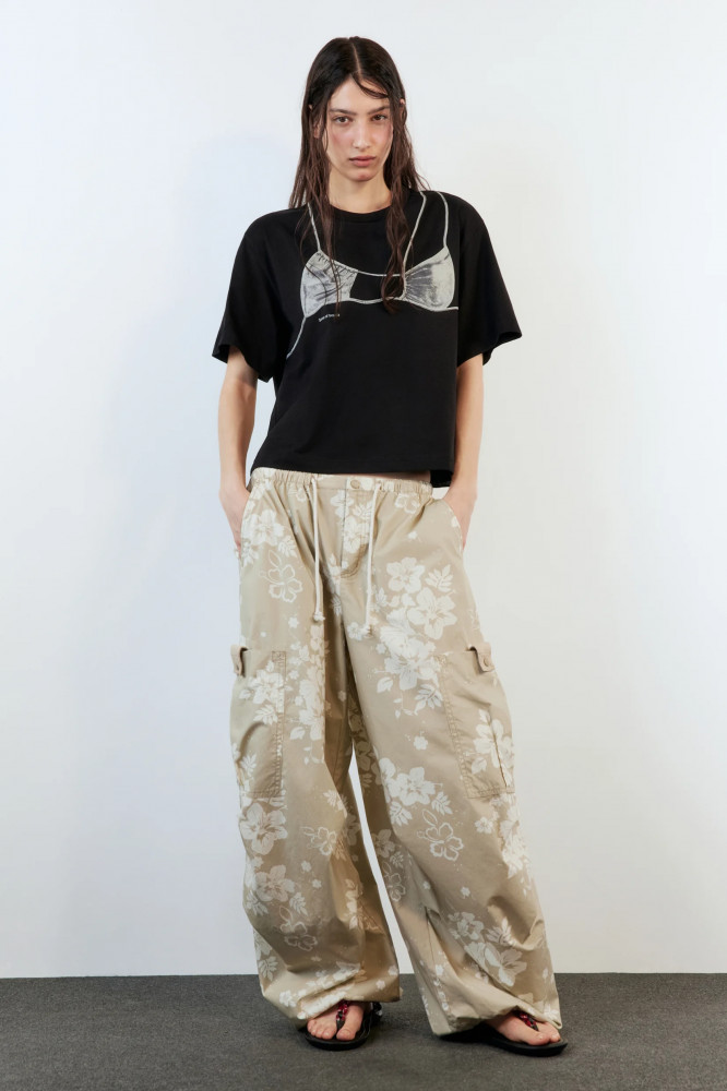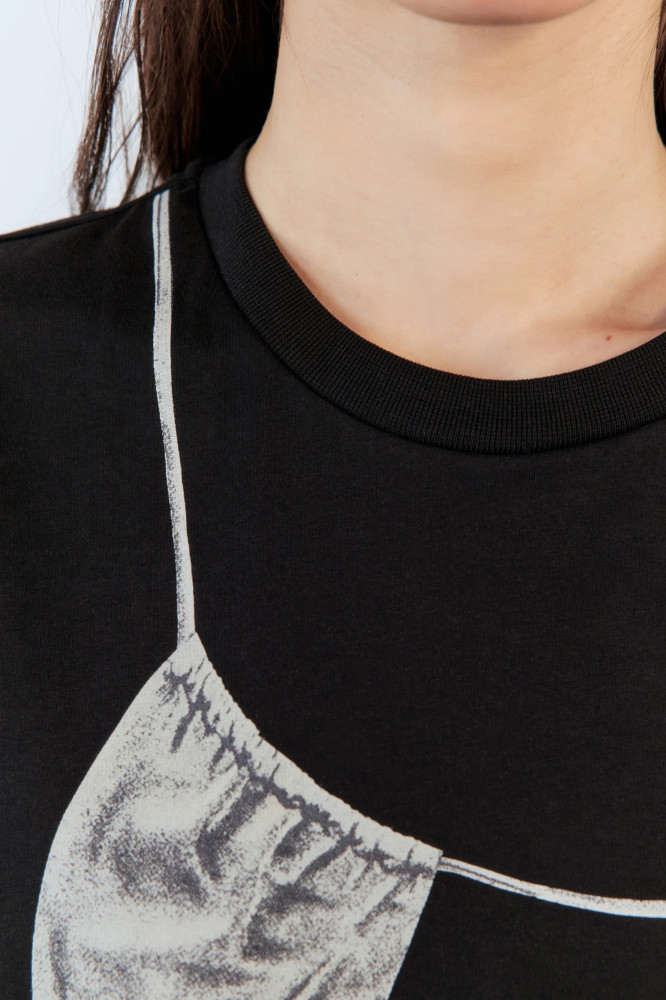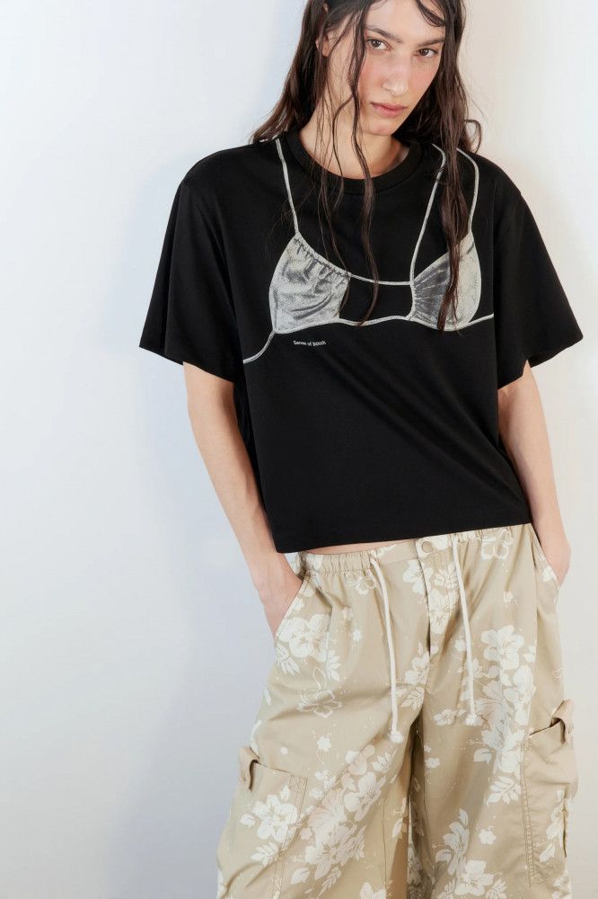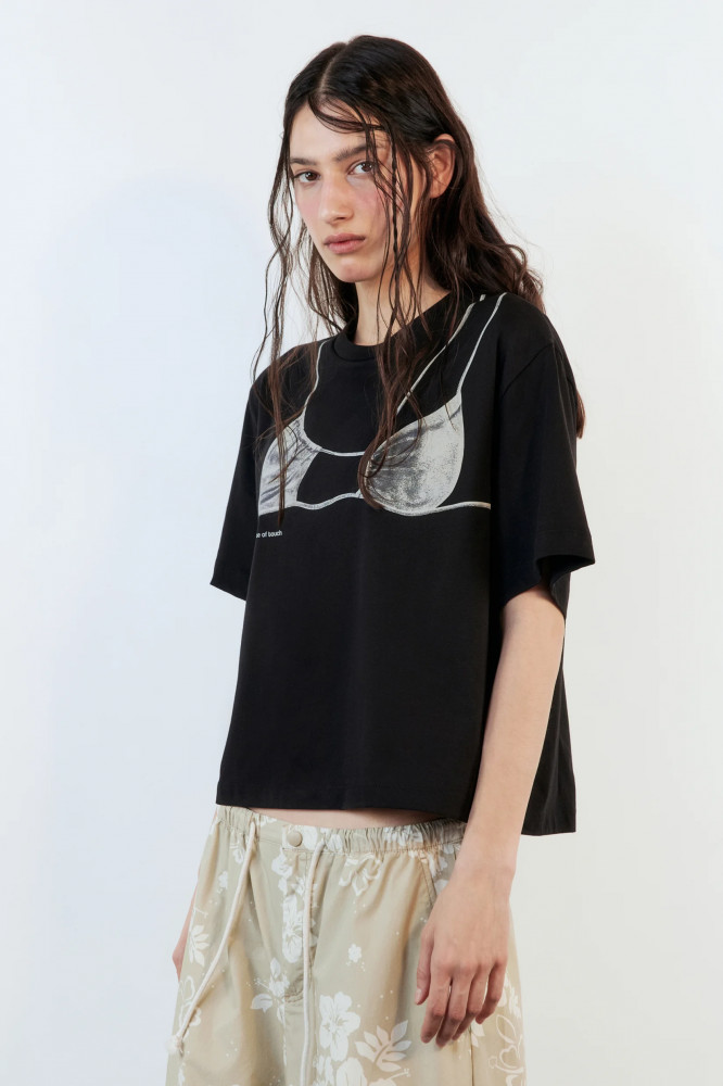 Короткая женская футболка свободного кроя oversize из легкой, дышащей, приятной к телу 100% хлопковой ткани с гладкой трикотажной фактурой. Классический круглый вырез горловины без воротника, короткие свободные рукава со спущенной линией плеча и прямыми манжетами без подворотов, прямой нижний край без разрезов и декоративных элементов. Свободная дышащая футболка с игривым принтом-бикини из новой летней коллекции внесет приятное разнообразие в твои аутфиты и гарантированно не оставит тебя без внимания. Носи хлопковую оверсайз-футболку гранж с дерзким, рваным, объемным или, наоборот, подчеркивающим фигуру низом.