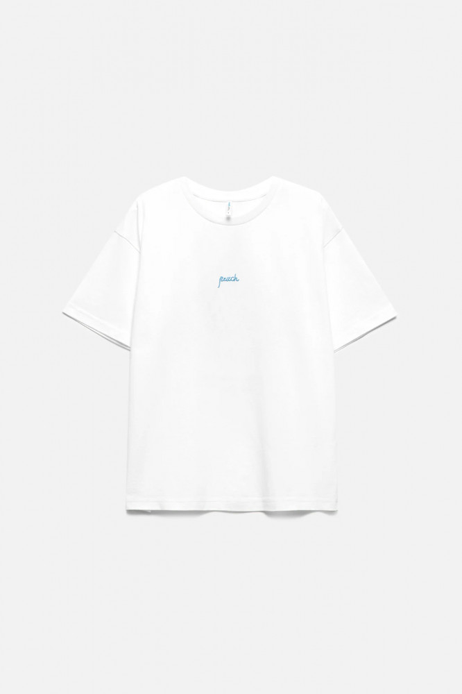 Удлиненная женская футболка свободного прямого кроя из мягкой, легкой, дышащей 100% хлопковой ткани с гладкой трикотажной фактурой. Короткие свободные рукава выше локтя без отворотов, спущенная линия плеча, классический круглый вырез горловины без воротника, прямой нижний край без разрезов и декоративных элементов.