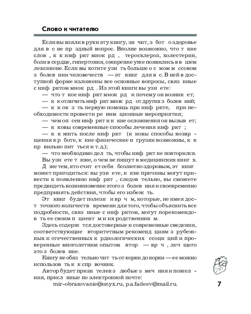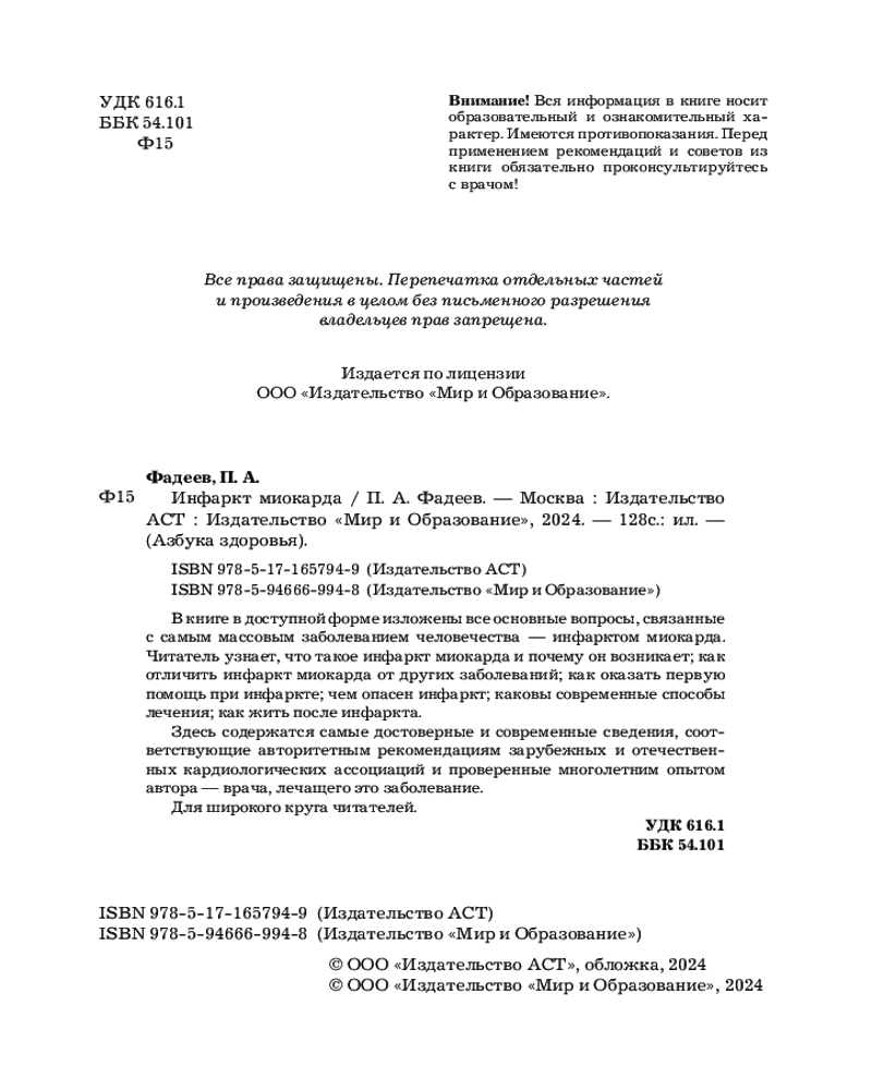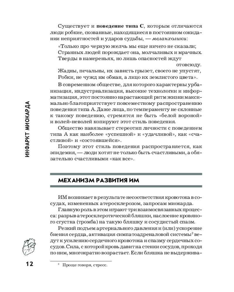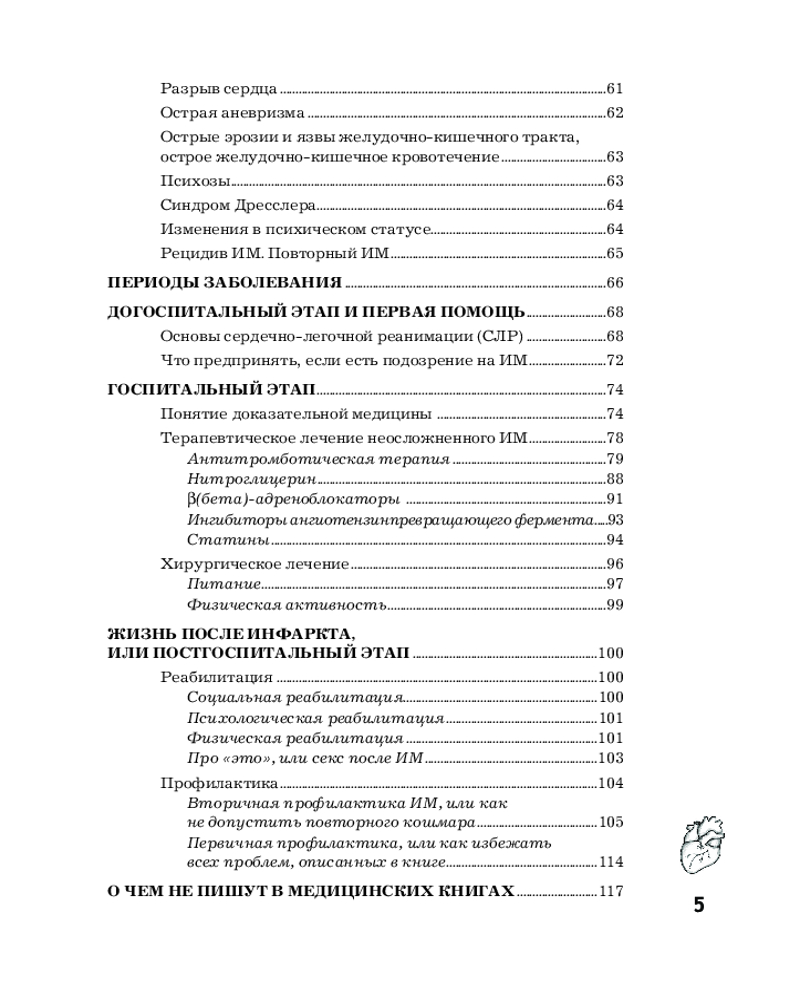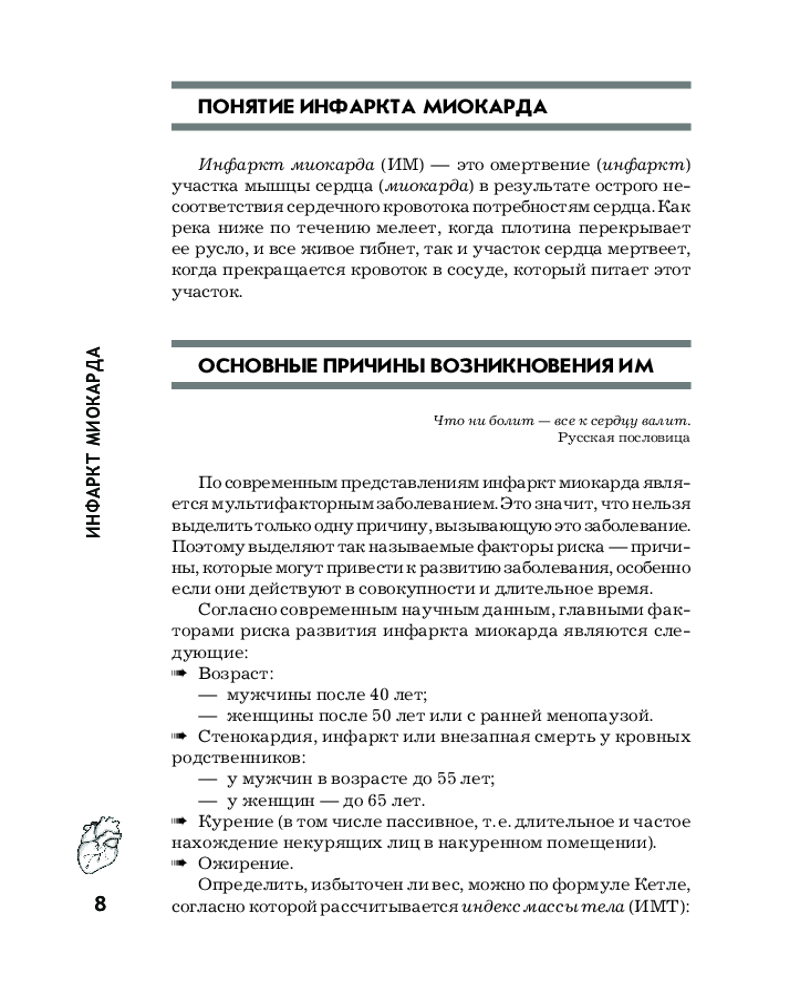Серия: Азбука здоровья В книге в доступной форме изложены все основные вопросы, связанные с самым массовым заболеванием человечества — инфарктом миокарда. Читатель узнает, что такое инфаркт миокарда и почему он возникает; как отличить инфаркт миокарда от других заболеваний; как оказать первую помощь при инфаркте; чем опасен инфаркт; каковы современные способы лечения; как жить после инфаркта. Здесь содержатся самые достоверные и современные сведения, соответствующие авторитетным рекомендациям зарубежных и отечественных кардиологических ассоциаций и проверенные многолетним опытом автора — врача, лечащего это заболевание. Для широкого круга читателей. |