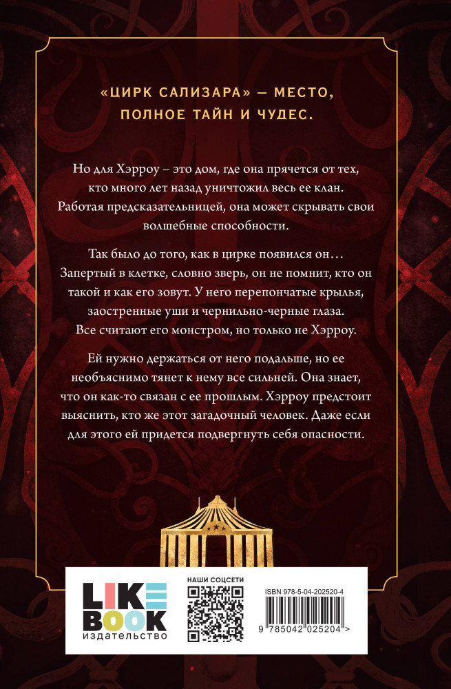 Серия: Young Adult. Любовная магия. Бестселлеры ромэнтези «Цирк Сализара» — место, полное тайн и чудес. Но для Хэрроу — это дом, где она прячется от тех, кто много лет назад уничтожил весь ее клан. Работая предсказательницей, она может скрывать свои волшебные способности. Так было до того, как в цирке появился он... Запертый в клетке, словно зверь, он не помнит, кто он такой и как его зовут. У него перепончатые крылья, заостренные уши и чернильно-черные глаза. Все считают его монстром, но только не Хэрроу. Ей нужно держаться от него подальше, но ее необъяснимо тянет к нему все сильней. Она знает, что он как-то связан с ее прошлым. Хэрроу предстоит выяснить, кто же этот загадочный человек. Даже если для этого ей придется подвергнуть себя опасности. |