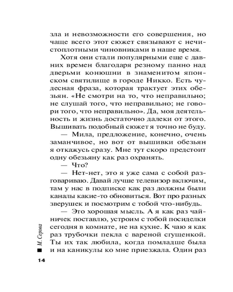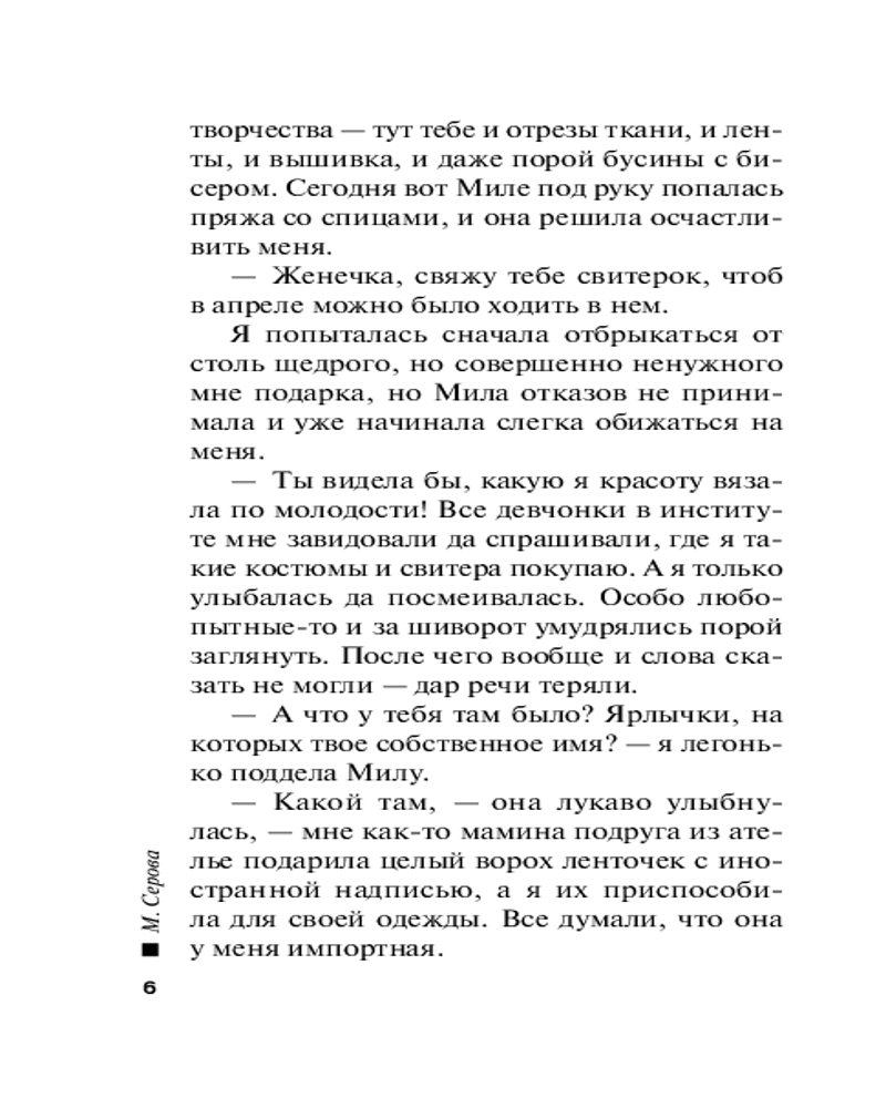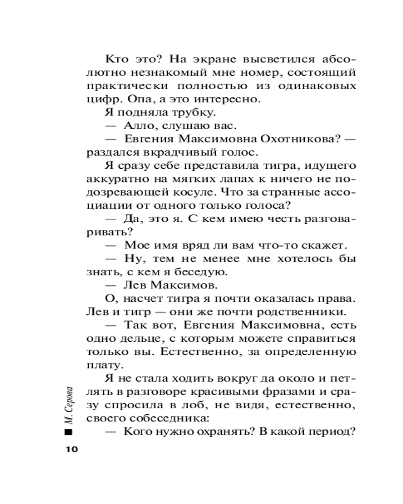 | Марина Сергеевна Серова — один из ведущих авторов серии современного русского детективного жанра (существует версия, что это коллектив авторов под общим руководством литературного агента Сергея Потапова). Согласно легенде, «выпускница юридического факультета МГУ, работала в Генеральной прокуратуре, сотрудница одной из спецслужб, участвовала в боевых операциях». Между тем написала 425 произведений размером порядка 200 страниц (и число их постоянно увеличивается). Часть произведений... |