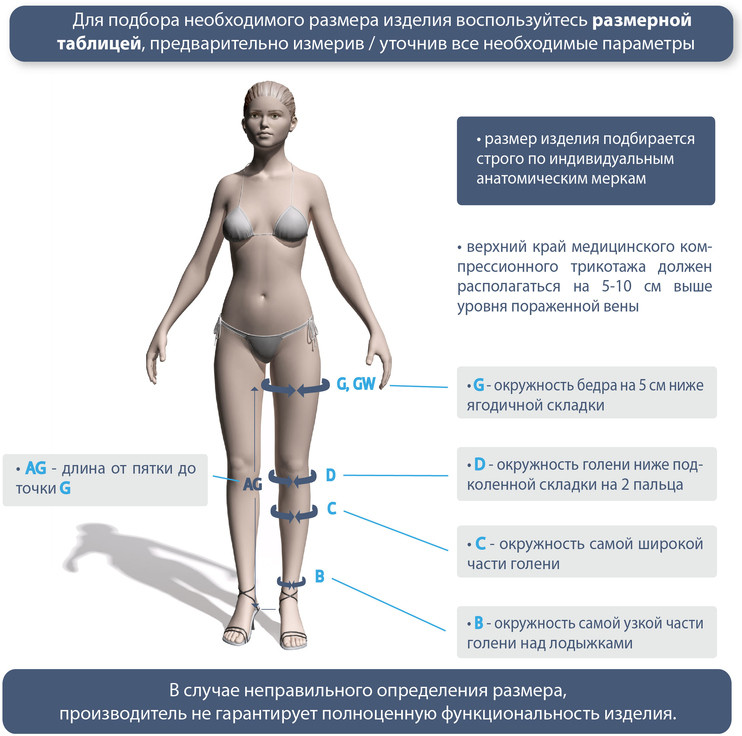 Внимание! правильно подобранное по размеру изделие в первые дни применения может вызывать неприятные ощущения, усиление болей. До снятия отека этими жалобами следует пренебречь, для адаптации к компрессионному трикотажу допускается сокращение времени его использования с последующим ежедневным увеличением до нужной продолжительности.