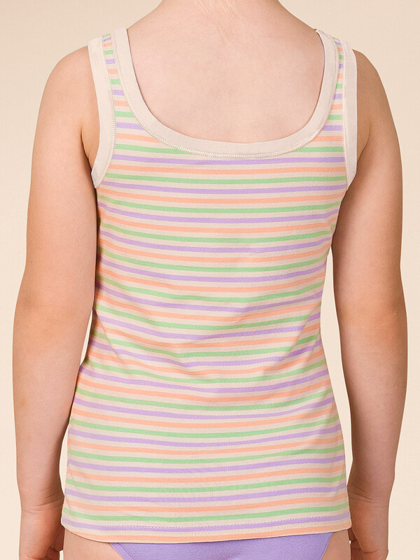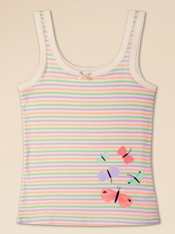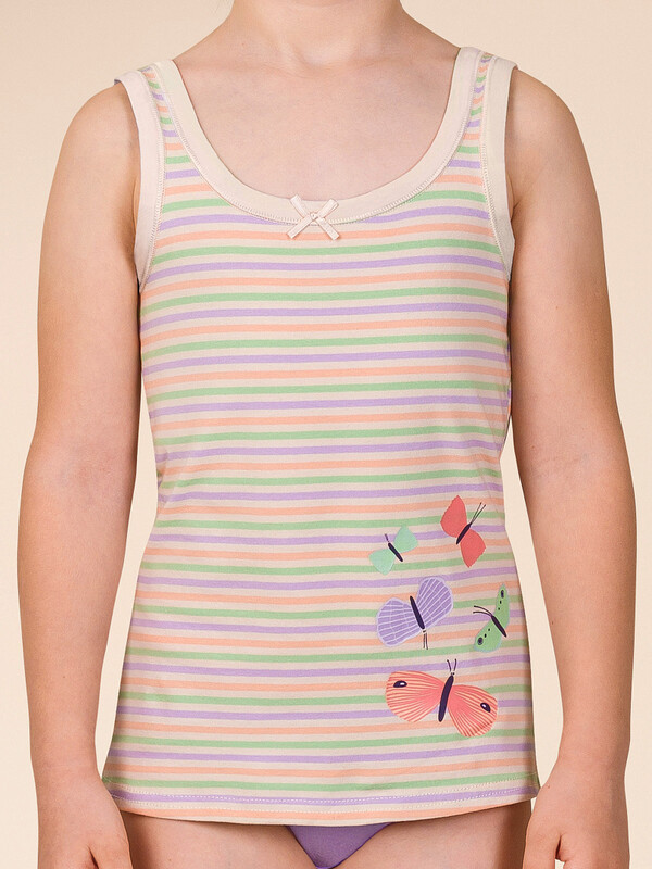 Каждая мама заботится о комфорте своего ребёнка и хочет выбрать для него только действительно качественное бельё. Наша красивая майка для девочки отлично подходит под эти запросы. Майка детская выполнена из ткани с высоким содержанием хлопка — она приятна на ощупь, великолепно пропускает воздух, позволяя коже ребёнка дышать. Эластан помогает изделию сохранять отличную форму в течение длительного времени. Качественная ткань и правильный крой гарантируют идеальную посадку — ребёнок чувствует себя комфортно целый день. Горловина и проймы обработаны эластичным пайпингом в тон — они не растягиваются и надолго сохраняют прекрасный внешний вид. Хлопковая майка персикового цвета в полоску подойдёт любой девочке. Майка декорирована милым принтом в виде бабочек и атласным бантиком. Принт мягкий и устойчивый, отлично переносит стирки. Нательная майка для девочки — идеальный выбор для повседневной носки под одеждой, а также она подходит для летнего отдыха и в качестве домашней одежды.