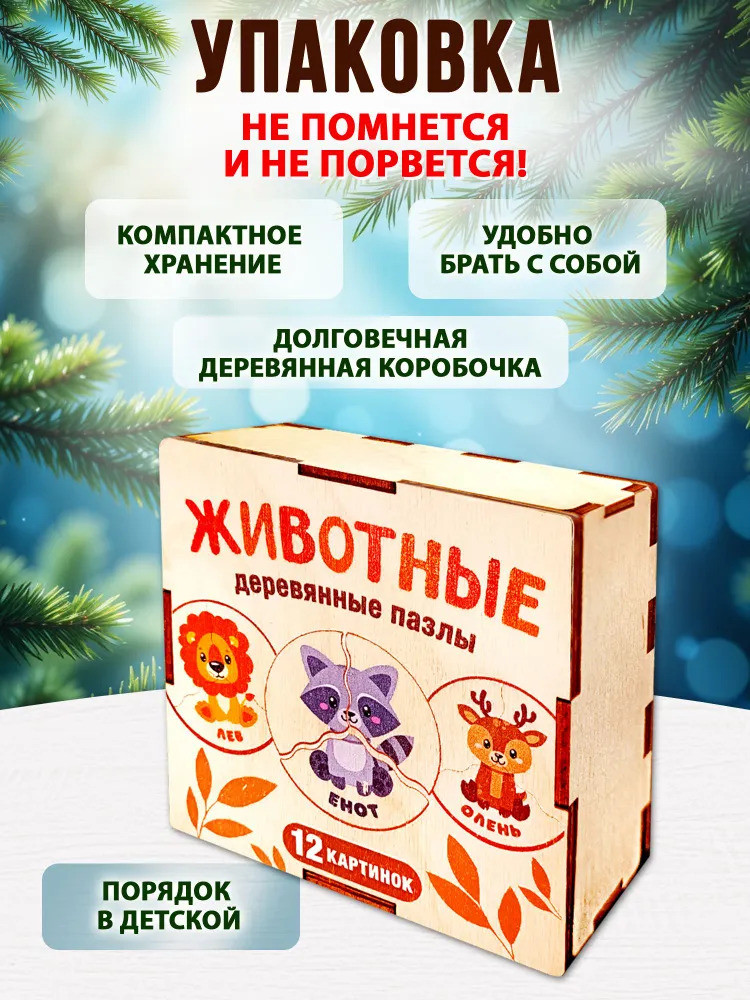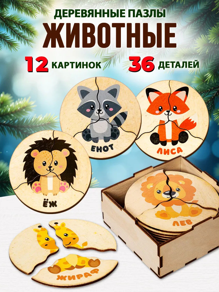 • 12 пазлов из древесного материала из 3 элементов каждый;
