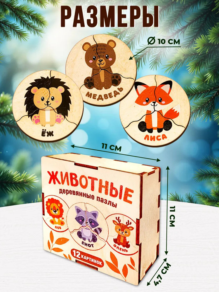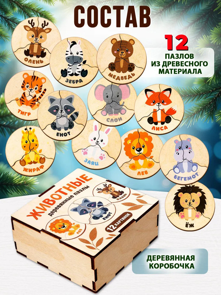 В данный момент этот товар отсутствует в продаже. Возможно, у нас найдется аналогичный или похожий товар здесь. Деревянные пазлы для детей «Животные» 12 картинок — интересная развивающая игра с элементами из древесного материала (экологичной березовой фанеры). На картинках изображены животные — слон, бегемот, лев, зебра, жираф, тигр, олень, медведь, лиса, заяц, енот, ёж. Края элементов закруглены и тщательно обработаны.