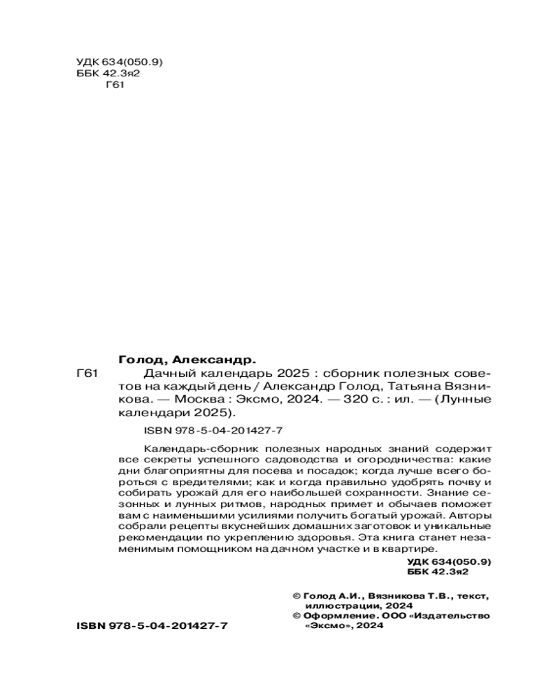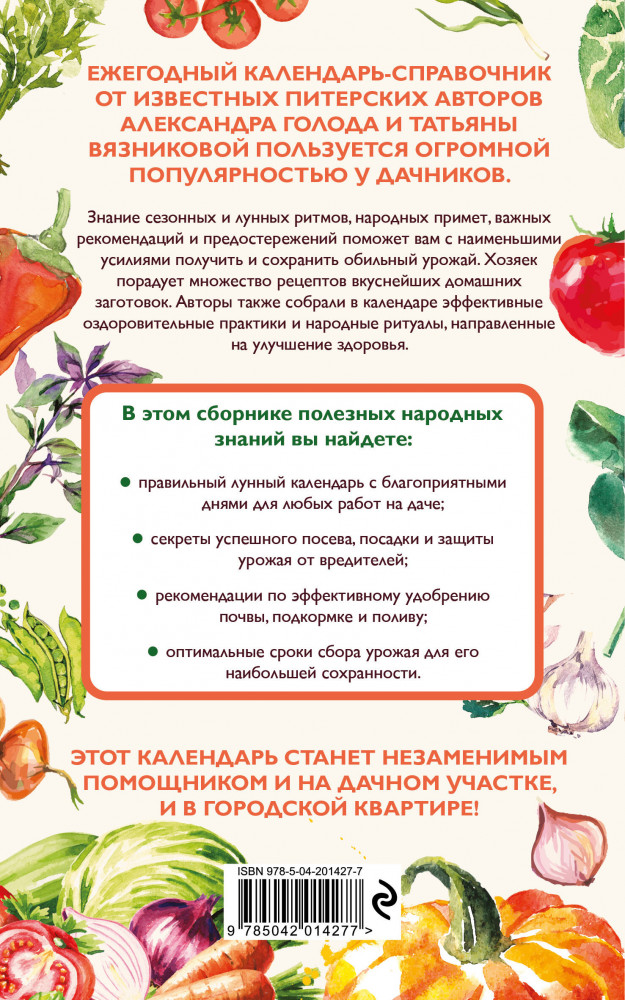 Дачный календарь 2025. Сборник полезных советов на каждый деньАлександр Ильич Голод, Татьяна Вязникова В данный момент этот товар отсутствует в продаже. Возможно, у нас найдется аналогичный или похожий товар здесь. Серия: Лунные календари 2025 Откройте новый дачный сезон с дачным календарем известных питерских авторов Александра Голода и Татьяны Вязниковой! Знание сезонных и лунных ритмов, народных примет, важных рекомендаций и предостережений поможет вам с наименьшими усилиями получить и сохранить обильный урожай. Хозяек порадует множество рецептов вкуснейших домашних заготовок. Авторы также собрали в календаре эффективные оздоровительные практики и народные ритуалы, направленные на улучшение здоровья. Этот календарь-справочник станет незаменимым помощником и на дачном участке, и в городской квартире! |