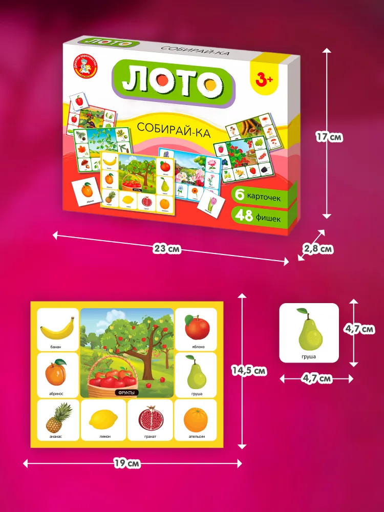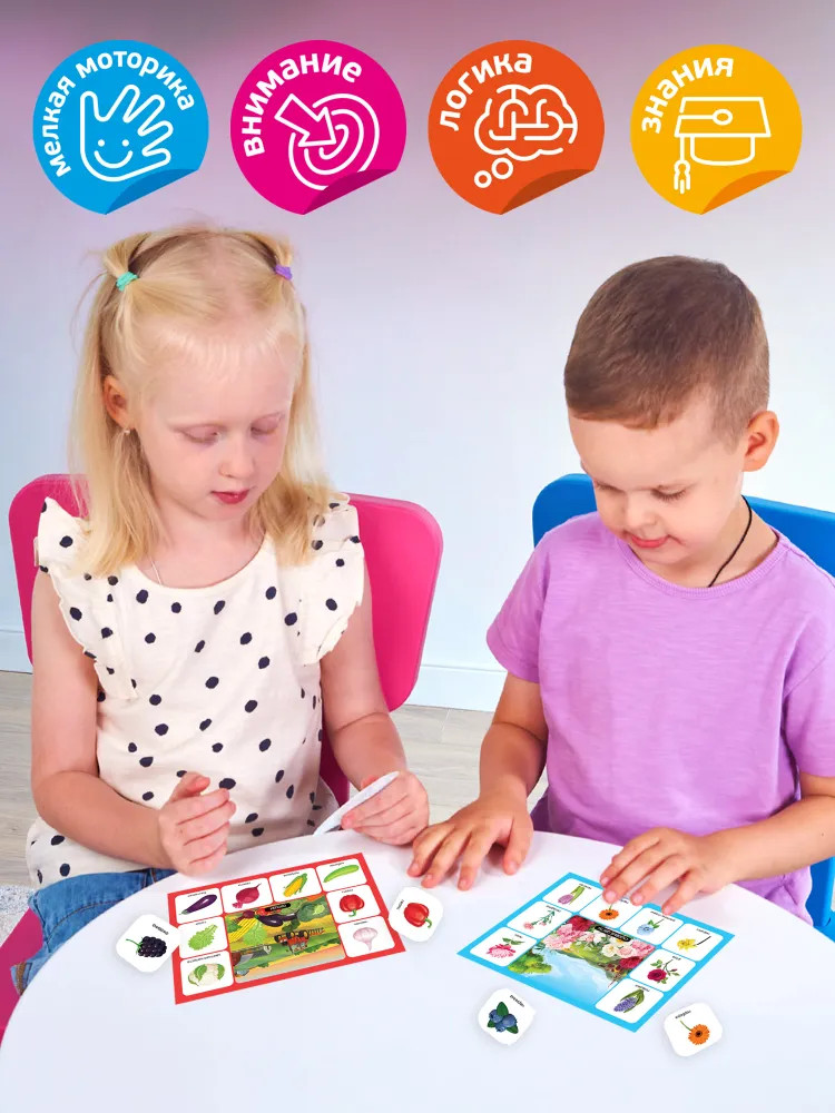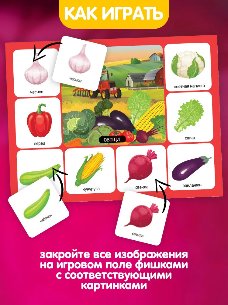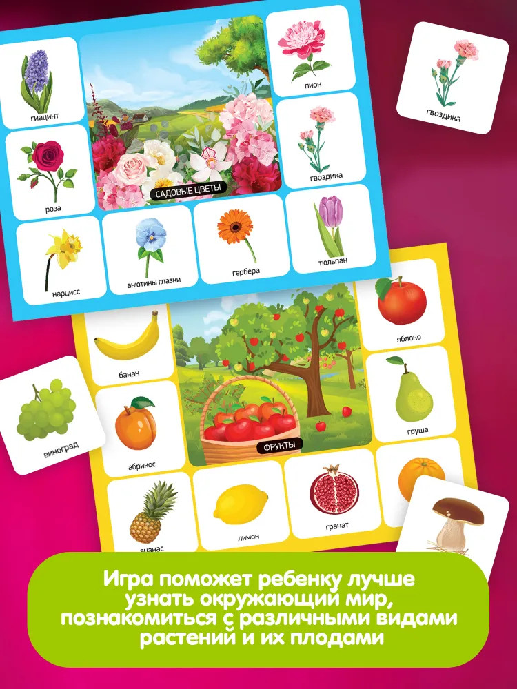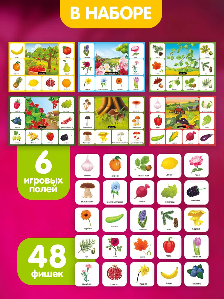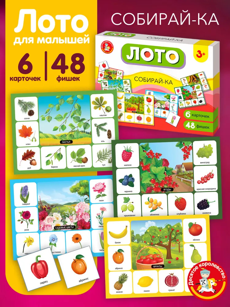 Лото для малышей «Собирай-ка» (большое) — это развивающая игра, которая поможет ребенку лучше узнать окружающий его мир, познакомиться с тем, какие растения окружают нас. |