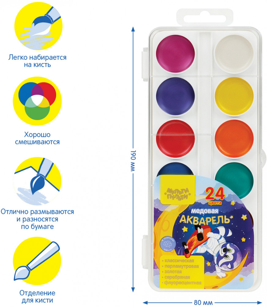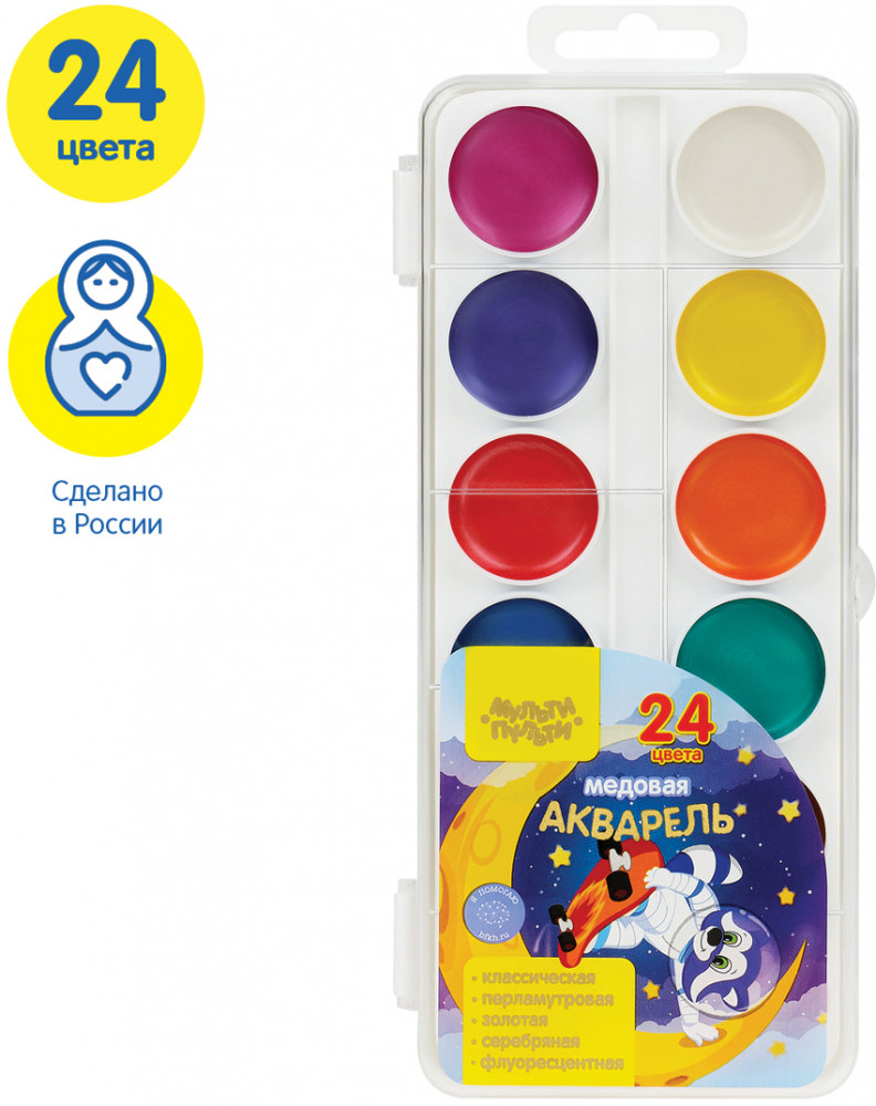 💳 Оплатить за товар можно при получении 🇰🇿 Есть бесплатная доставка по Казахстану 🎁 Копите бонусы с каждой покупки Серия: Приключения Енота Краски Мульти-Пульти «Енот в космосе» обладают хорошей укрывистостью и остаются яркими при высыхании. Смешивание акварели Мульти-Пульти дает чистые оттенки. Натуральные компоненты делают ее безопасной для здоровья детей. Пластиковая упаковка акварели удобна в использовании. В составе набора классическая палитра из 12 цветов, а также 8 перламутровых цветов, золото, серебро и 2 флуоресцентных цвета. Для детей старше 3-х лет. |