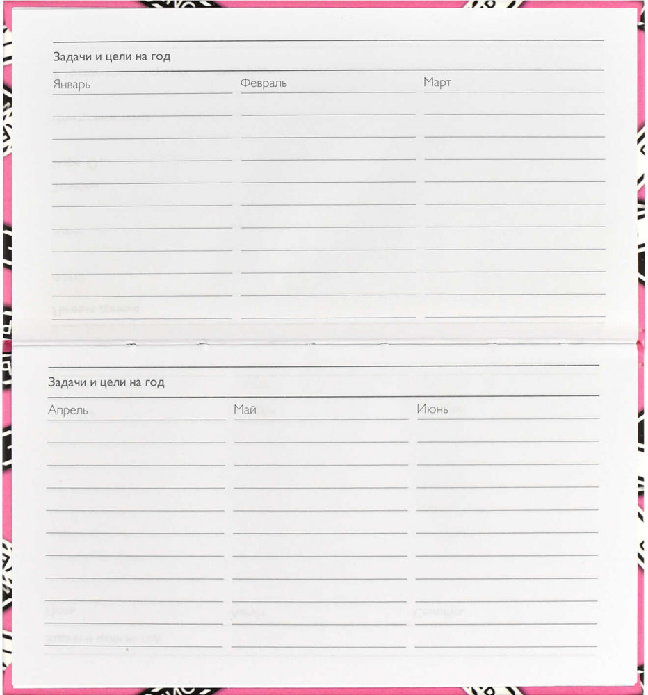 Еженедельник хороший. Страницы достаточно плотные, белые, линовка достаточно широкая, писать удобно. Структура блокнота следующая. На первой странице общая информация: ФИО, адрес, эл.почта. Затем два разворота: задачи и цели на год. Первый разворот - с января по июнь, второй - с июля по декабрь. Потом собственно еженедельник. Последние семь разворотов - адреса и телефоны ( на одном развороте 4 буквы алфавита). Последний разворот - заметки. Обложка не такая пугающе яркая, как на фото, скорее матовая, без ламинации, поблескивают только ленточки с надписями. Не жалею, что рискнула и заказала.