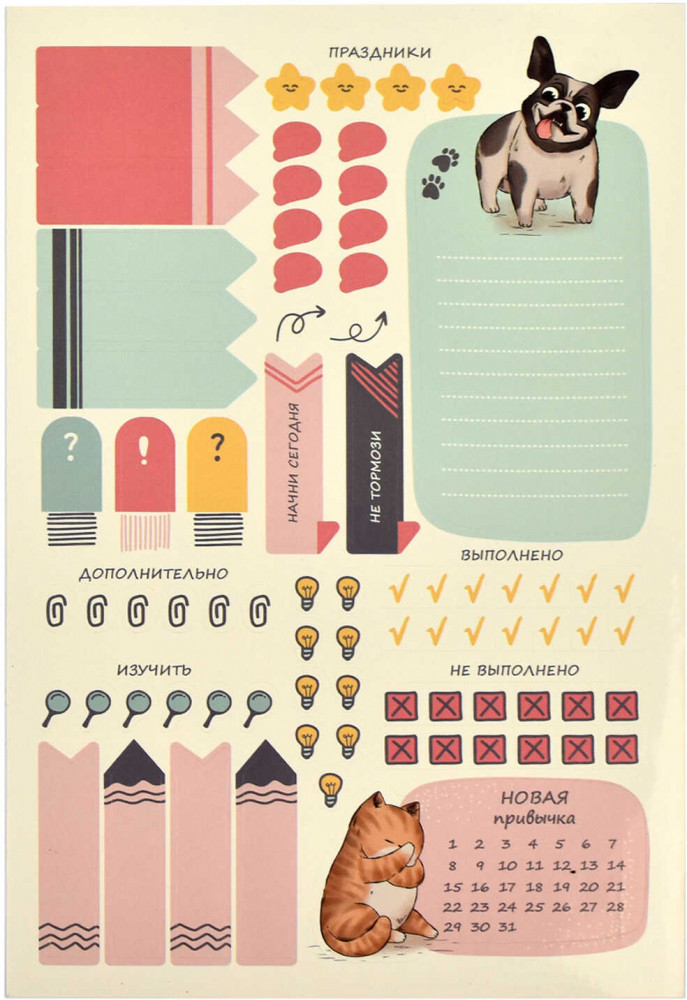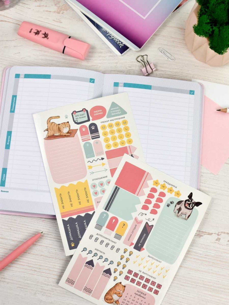 Этот планинг сочетает стильный дизайн и функциональность, идеально подходя для учебных или организационных целей. В комплекте два листа с наклейками и карман на форзаце для хранения мелочей. |