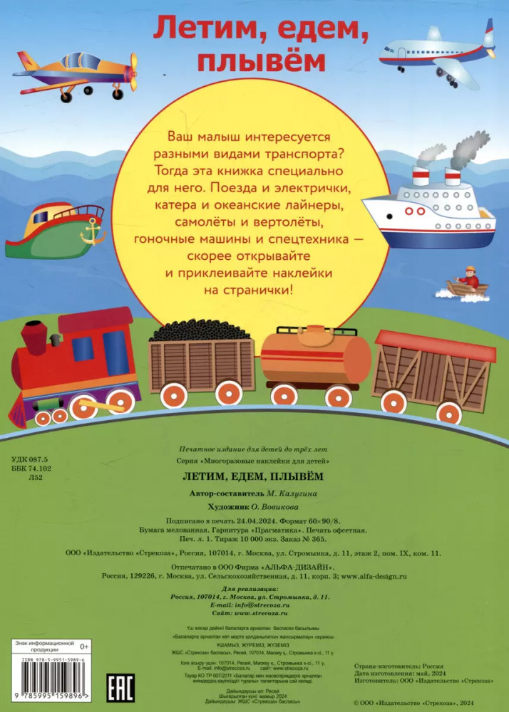 Серия: Многоразовые наклейки Ваш малыш интересуется разными видами транспорта? Тогда эта книжка специально для него. Поезда и электрички, катера и океанские лайнеры, самолёты и вертолёты, гоночные машины и спецтехника — скорее открывайте и приклеивайте наклейки на странички. |