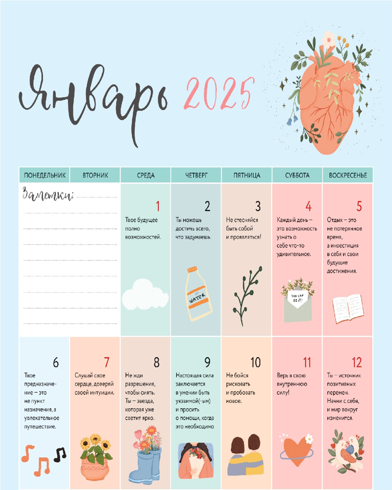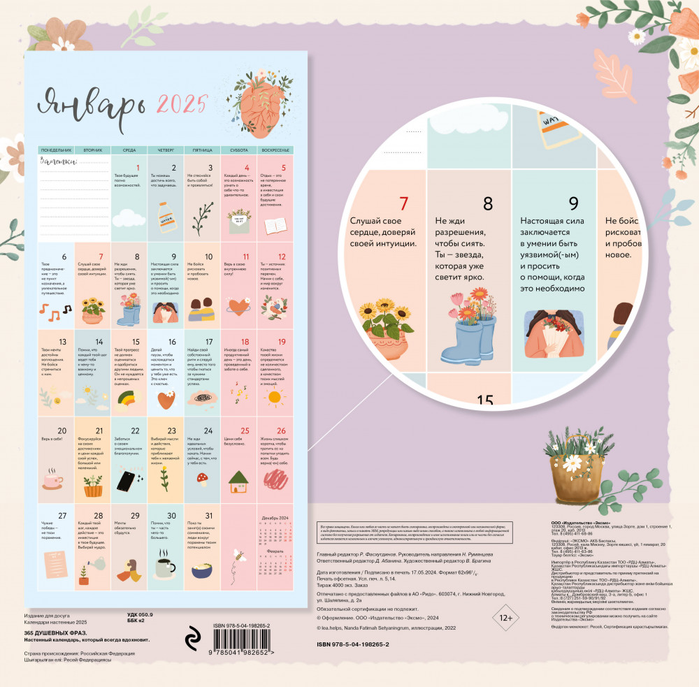 Календарь настенный на 2025 год «365 душевных фраз»В данный момент этот товар отсутствует в продаже. Возможно, у нас найдется аналогичный или похожий товар здесь. Серия: Календари настенные 2025 (300×300) Настенный календарь, который обнимет и согреет! В нем собраны поддерживающие слова на каждый день, которые мотивируют никогда не сдаваться. Только обладая уверенностью в себе и своих силах, можно добиваться любых высот. Календарь создан совместно с психологическим проектом lea.helps (более 38,9 тыс. подписчиков). В нем участвуют как реальные специалисты, так и виртуальный ИИ-психолог. Календарь впишется в любую рабочую атмосферу, в нем нет ярких или раздражающих цветов. На каждый месяц предусмотрено место для личных заметок. |