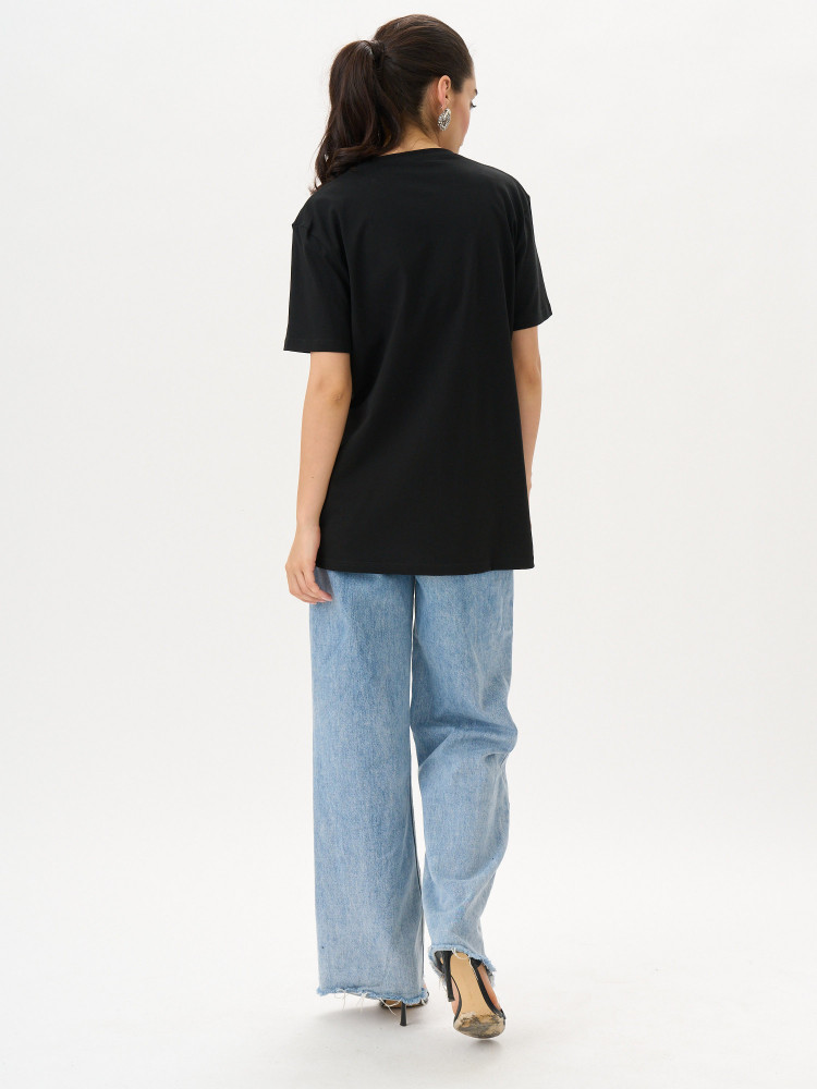 Футболка прямого покроя с втачными короткими рукавами. По линии горловины втачен ворот из эластичного полотна с 5% добавлением лайкры. Перед и спинка цельнокроеные. Плечевые швы обтачены бейкой из основного полотна, в край проложена отделочная строчка. Низ футболки и рукава подогнуты и подшиты на распошивальной машине.