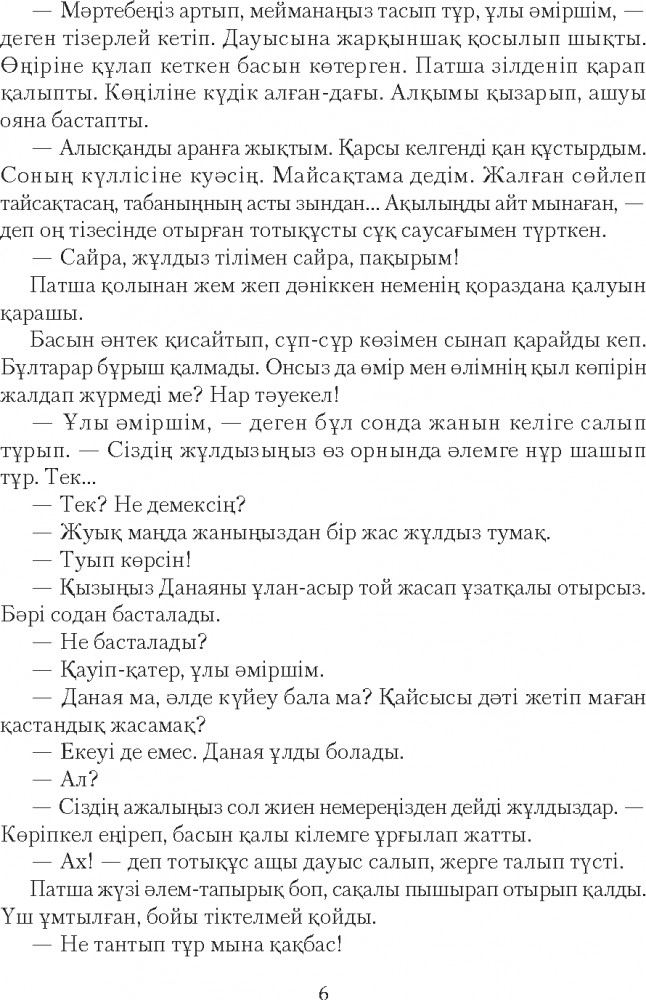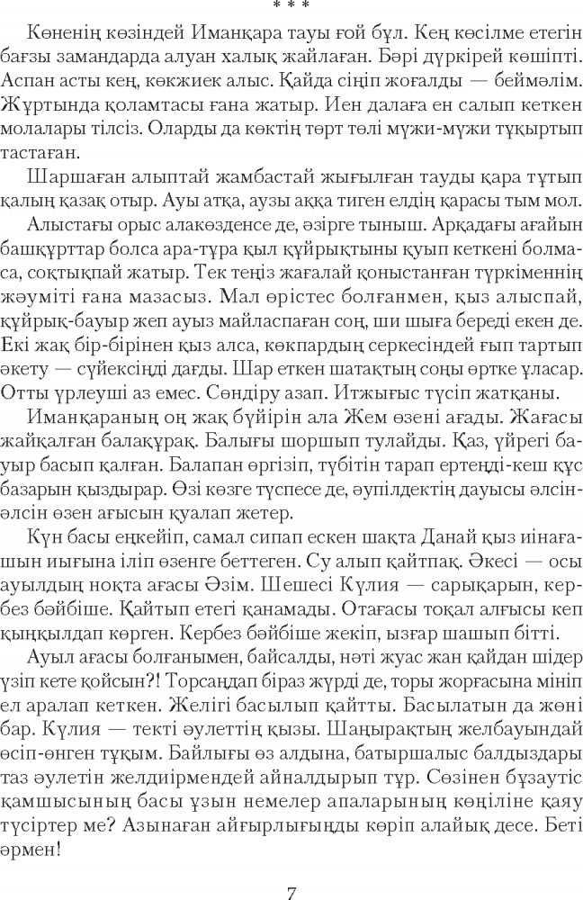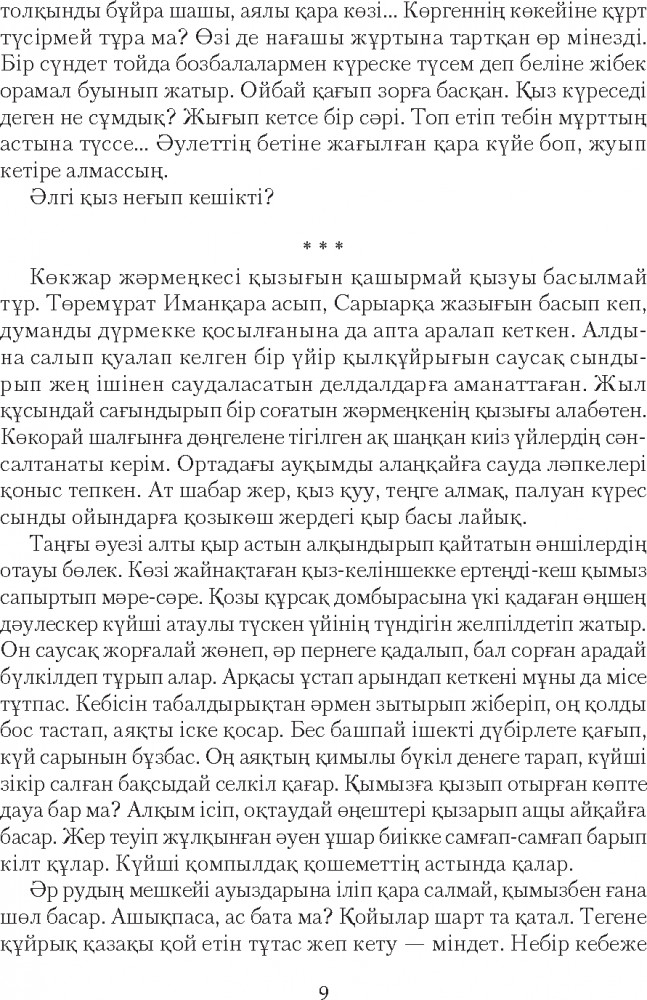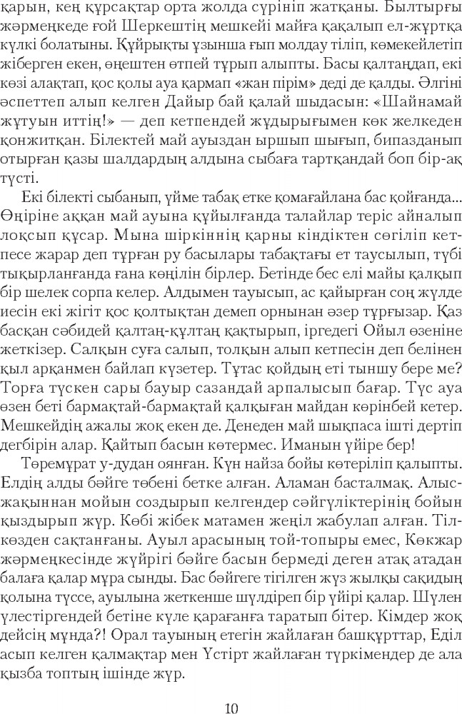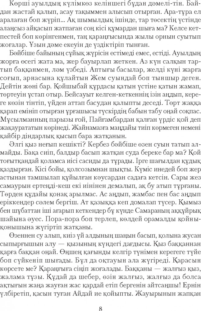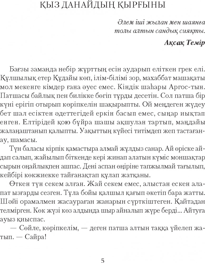 Серия: Сөз-маржан Қазақ прозасының көрнекті өкілі, жазушы-драматург Рахымжан Отарбаевтың бұл кітабына «Қыз Данайдың қырғыны» романы және «Шыңғыс ханның көз жасы», «Дүние ғайып», «Бесқасқа Беріштің хикаясы», «Төрттаған» хикаяттары еніп отыр. Қаламгер шығармаларында өмірдегі қайшылықтар мен күрестерді рухани ішкі қайшылықтармен астастырып береді. Тарихи һәм бүгінгі заман кейіпкерлерінің табиғатын, мінезін шебер суреттей отырып, бәріне ортақ «мәңгілік мәселелер» жайлы терең ой қозғайды. |