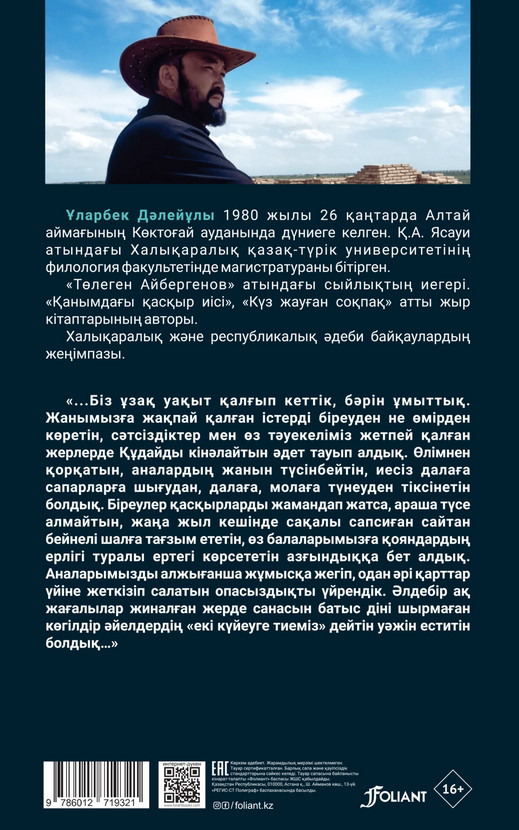 Серия: Бүгінгі проза Ұларбек Дәлейұлыны бұл кітабында қамсыз балалық шақ, өткен өмір елестері өзгеше стильмен өрнектеледі. 1939–1958 жылдары арасында қытайды екі билігімен қатар күрескен қазақ көтерілісшілерінің ерлікке толы, аңызға бергісіз хикаялары қазақы қоңыр тілмен баяндалады. Таулы аймақта, киіз үйде көрген таңғы түстей өте шыққан балғын шақтың естеліктері әр тұстан менмұндалайды. Жазушы көш жолында, «Сайтан асу» бойында, шаңды соқпақтарды жиегінде қалған елестер арқылы бүгінгі өмір сұлбасын дәл суреттейді. |