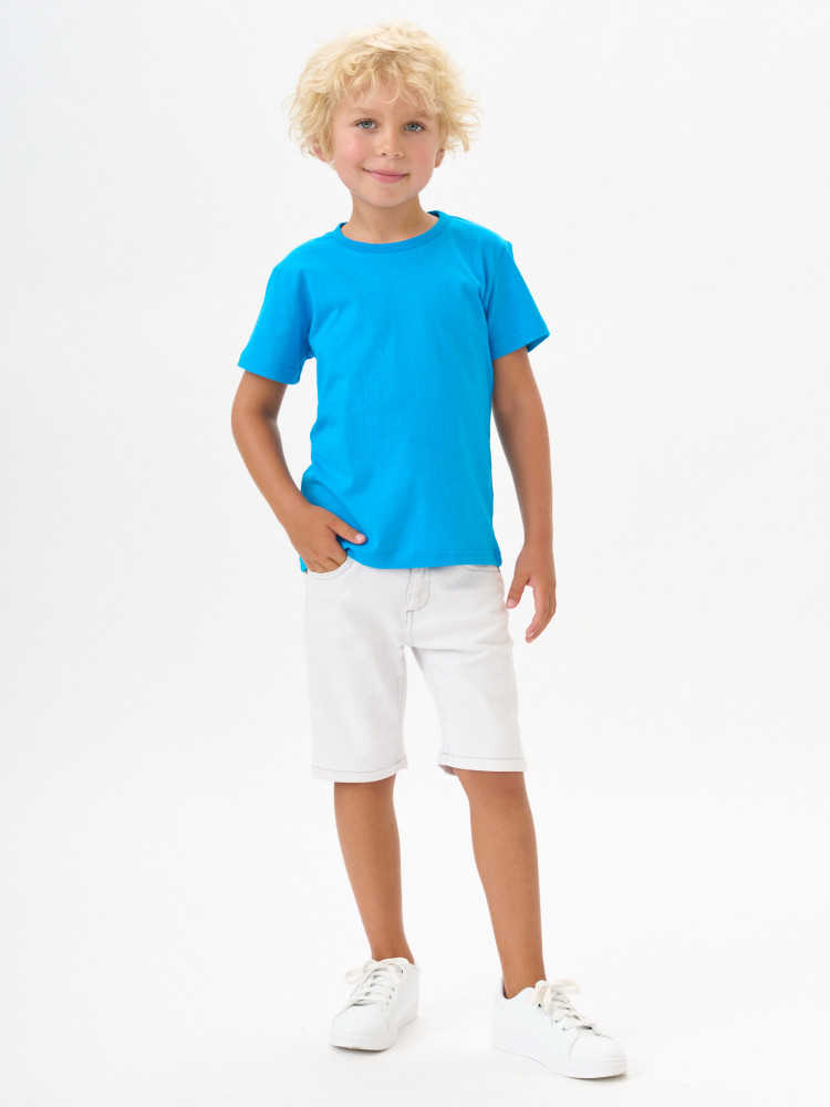 Футболка прямого покроя с втачными короткими рукавами. Используемое полотно — кулирная гладь из пряжи №30/1. По линии горловины втачен ворот из эластичного полотна с 5% добавлением лайкры. Перед и спинка цельнокроеные. Плечевые швы обтачены бейкой из основного полотна, в край проложена отделочная строчка. Низ футболки и рукава подогнуты и подшиты на распошивальной машине.