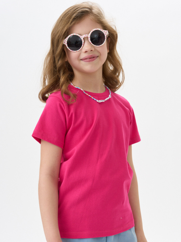 очень насыщенный розовый цвет! Красивая, соответсвует указанным параметрам. ткань мягкая, приятная телу. настоящая футболка для маленьких принцесс.