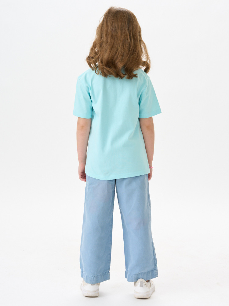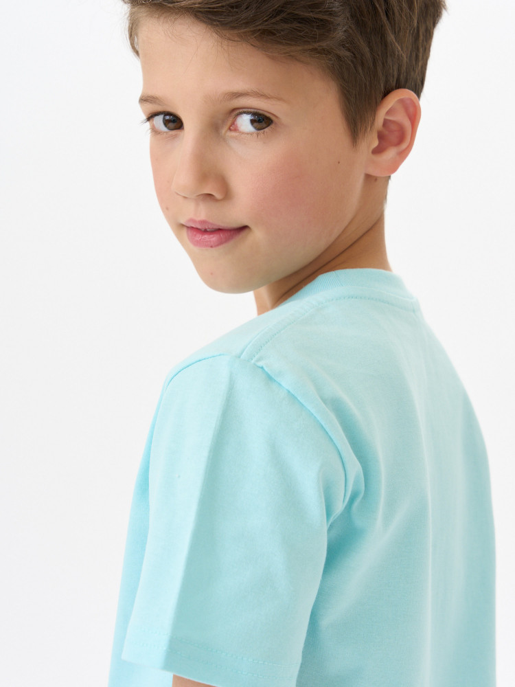 Футболка прямого покроя с втачными короткими рукавами. Используемое полотно — кулирная гладь из пряжи №30/1. По линии горловины втачен ворот из эластичного полотна с 5% добавлением лайкры. Перед и спинка цельнокроеные. Плечевые швы обтачены бейкой из основного полотна, в край проложена отделочная строчка. Низ футболки и рукава подогнуты и подшиты на распошивальной машине.