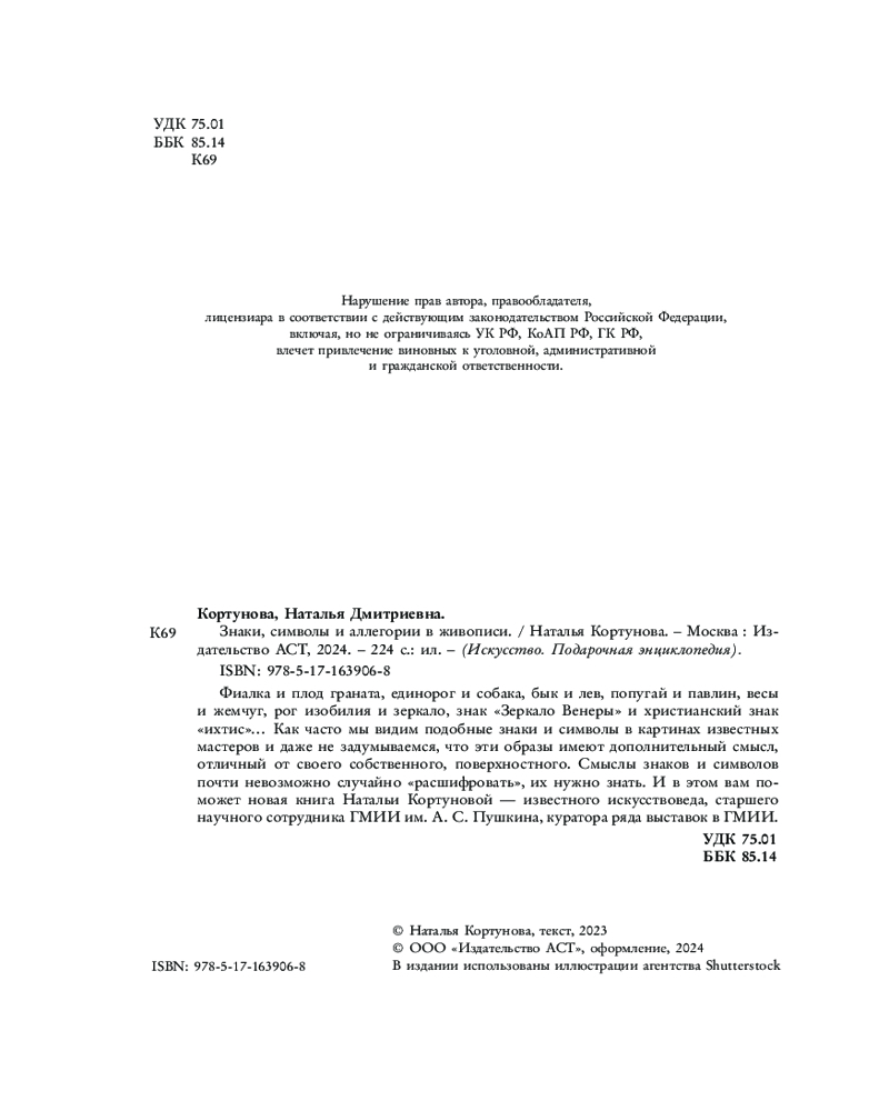 💳 Оплатить за товар можно при получении 🇰🇿 Есть бесплатная доставка по Казахстану 🎁 Копите бонусы с каждой покупки Серия: Искусство. Подарочная энциклопедия Фиалка и плод граната, единорог и собака, бык и лев, попугай и павлин, весы и жемчуг, рог изобилия и зеркало, знак «Зеркало Венеры» и христианский знак «ихтис»... Как часто мы видим эти и другие знаки и символы в картинах известных мастеров и даже не задумываемся, что эти образы имеют дополнительный смысл, отличный от своего собственного, поверхностного. Знаки эти, придающие работам глубины, таинственности и многослойности, существуют не только в области разума, но и в области чувств. Символы многообразны — они обозначаются числами, предметами и явлениями, формами и образами животных, птиц или насекомых, и так далее. Особенно ярко символы проявляют себя в живописи и скульптуре. От создателей этих известных ныне произведений изобразительного искусства нас отделяют сотни лет, а порой и целые тысячелетия. Эти люди существовали в иной системе жизненных координат и верили в иных богов. Сохранившиеся с тех давних времен памятники призваны были не только радовать глаз и удивлять тонкостью исполнения, но и несли в себе зачастую определенную идею, которую современники считывали без особого труда. Мы же, получая при знакомстве с данными памятниками сугубо эстетическое удовольствие, нередко упускаем из виду их смысловое значение, не обращая внимания на говорящие детали и |