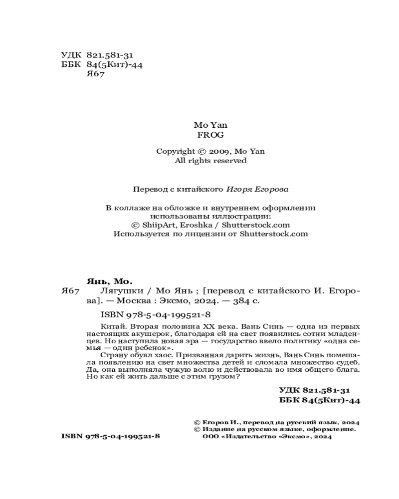 ЛягушкиВ данный момент этот товар отсутствует в продаже. Возможно, у нас найдется аналогичный или похожий товар здесь. Серия: Loft. Лучшие произведения Мо Яня Мо Янь — один из самых ярких и значимых китайских писателей, лауреат Нобелевской премии и премии Мао Дуня, самой престижной китайской литературной награды. Мо Янь как никто другой умеет запечатлеть на страницах своих произведений удивительную историю удивительной нации. В романе «Лягушки» рассказывается о тяжелейшем периоде в истории Китая — реализации политики по сокращению рождаемости, «одна семья — один ребенок». Отдельные человеческие судьбы покажут читателю судьбу целой страны. В переводе гениального китаиста Игоря Егорова. |