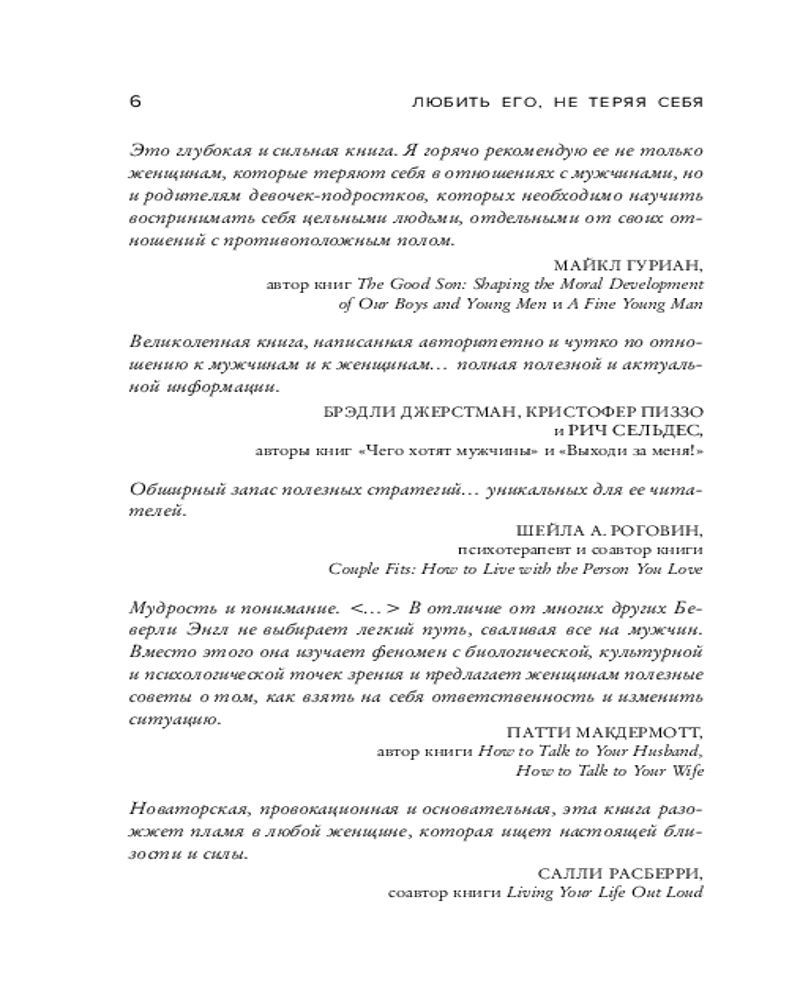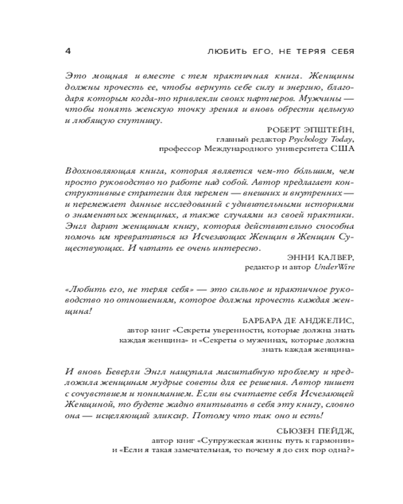 💳 Оплатить за товар можно при получении 🇰🇿 Есть бесплатная доставка по Казахстану 🎁 Копите бонусы с каждой покупки Серия: Карманный психолог. Готовые решения на все случаи жизни Часто в отношениях женщины ставят потребности партнеров выше собственных. В разгаре любовного романа они растворяются в мужчинах, пренебрегают карьерой, хобби, общением с друзьями или даже своим здоровьем. Такие женщины становятся Исчезающими, потому что из страха одиночества они готовы быть кем угодно, но не собой. В книге «Люби его, не теряя себя» Беверли Энгл, психотерапевт с 35-летним стажем, исследует причины, по которым так много женщин будто исчезают в отношениях, и предлагает простую программу, которая позволит стать женщиной Существующей. |