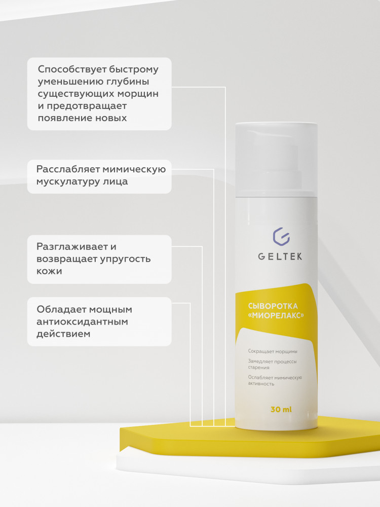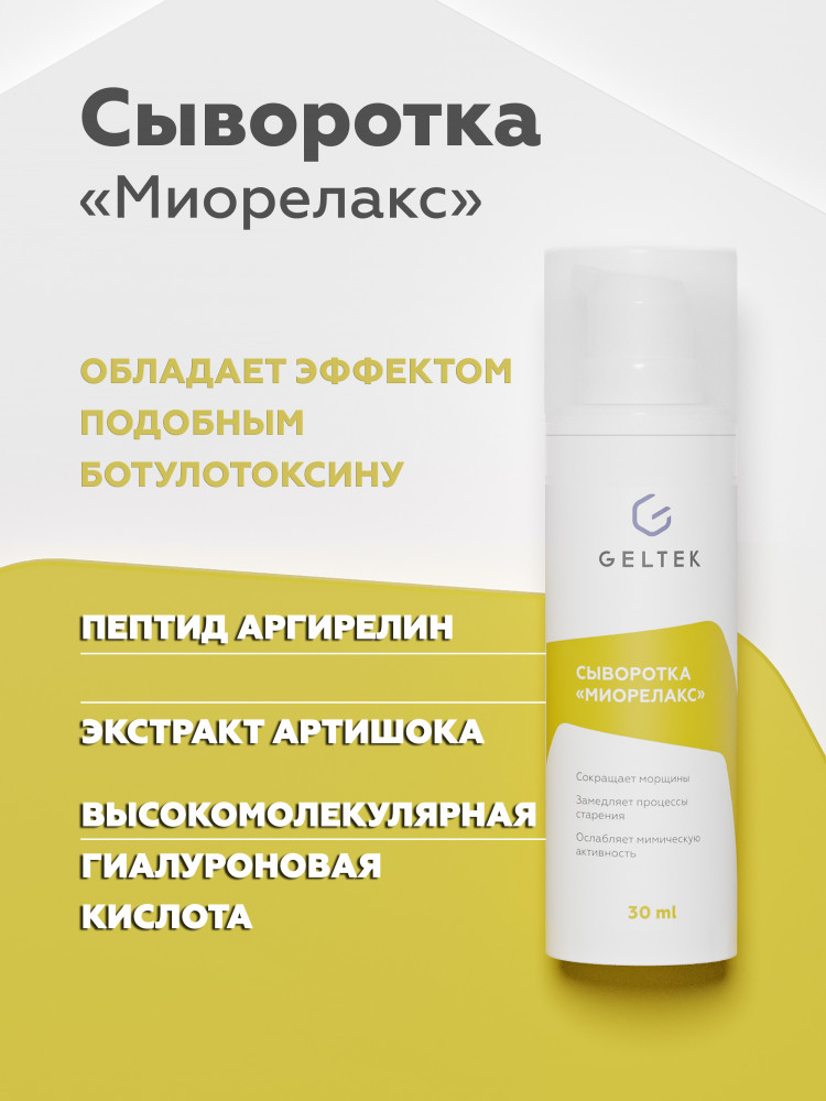 Geltek Сыворотка для лица «Миорелакс»В данный момент этот товар отсутствует в продаже. Возможно, у нас найдется аналогичный или похожий товар здесь. Сыворотка «Миорелакс» — это интенсивная сыворотка с эффектом, подобным действию Botulinum Toxin A. Применение сыворотки способствует быстрому уменьшению глубины существующих морщин и предотвращает появление новых. Сыворотка «Миорелакс» содержит пептид аргирелин, способный проникать в глубокие слои кожи и, воздействуя на нервные окончания, блокировать передачу нервного импульса на мимическую мускулатуру лица. Вследствие ослабления мимической активности разглаживаются существующие морщины и предотвращается появление новых. За счет мощного антиоксидантного и восстанавливающего действия экстракта артишока, сыворотка «Миорелакс» возвращает коже упругость и замедляет процесс старения, усиливает регенерацию кожи. Высокомолекулярная гиалуроновая кислота в составе сыворотки защищает кожу от воздействия внешней среды и предотвращает трансэпидермальную потерю влаги. |