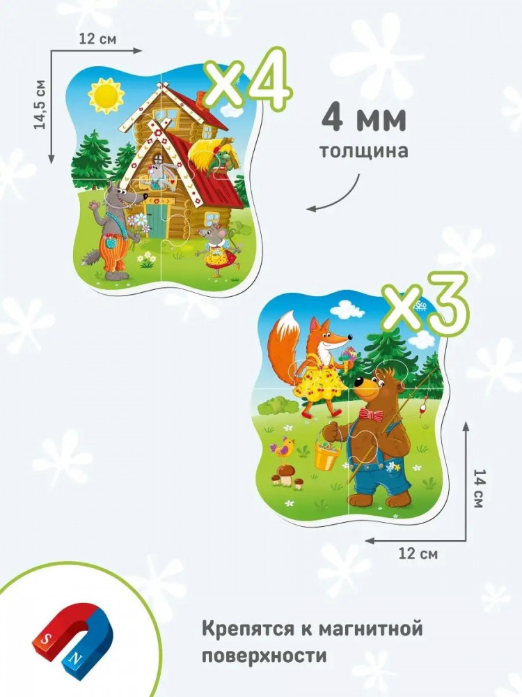 Мягкие магнитные пазлы для малышей — это очаровательные иллюстрации, нарисованные с учетом всех особенностей раннего детского развития. Мягкие магнитные объемные детали толщиной 4 мм выполнены из вспененного полимера. Пазлы разделены на 3-4 детали. Пазлы легко крепятся к любой металлической поверхности и не распадаются при сборке. Пазлы разделены на элементы оптимального размера для детской ручки. |