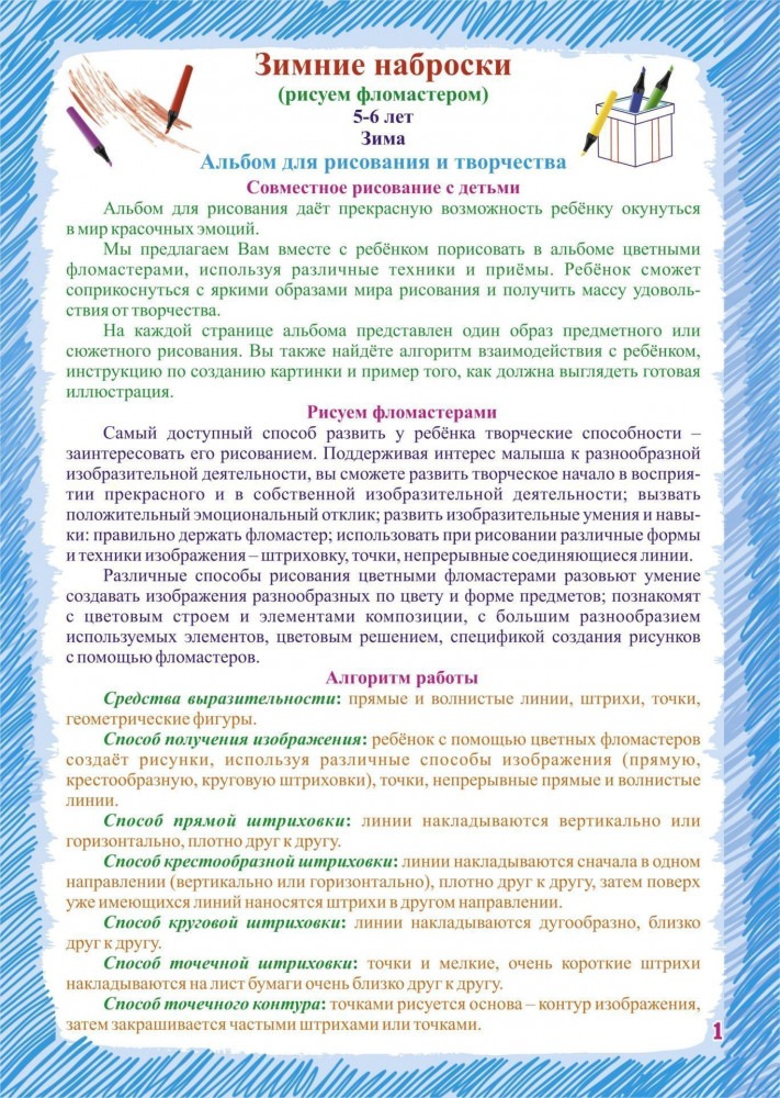 Рисуем фломастерами. Альбом для рисования, чтения и творчества. 5-6 лет. ЗимаТ. Н. Славина, Е. А. Кудрявцева В данный момент этот товар отсутствует в продаже. Возможно, у нас найдется аналогичный или похожий товар здесь. Серия: Развивающая раскраска Альбом предназначен для обучения детей 5-6 лет рисованию под руководством взрослых. Красочные страницы позволяют в доступной и увлекательной форме показывать ребенку способы рисования, развивают творческие способности малышей, помогают детям в совместной деятельности со взрослыми создавать сказочные картинки, вместе общаться и играть, знакомиться с сюжетным рисованием. |