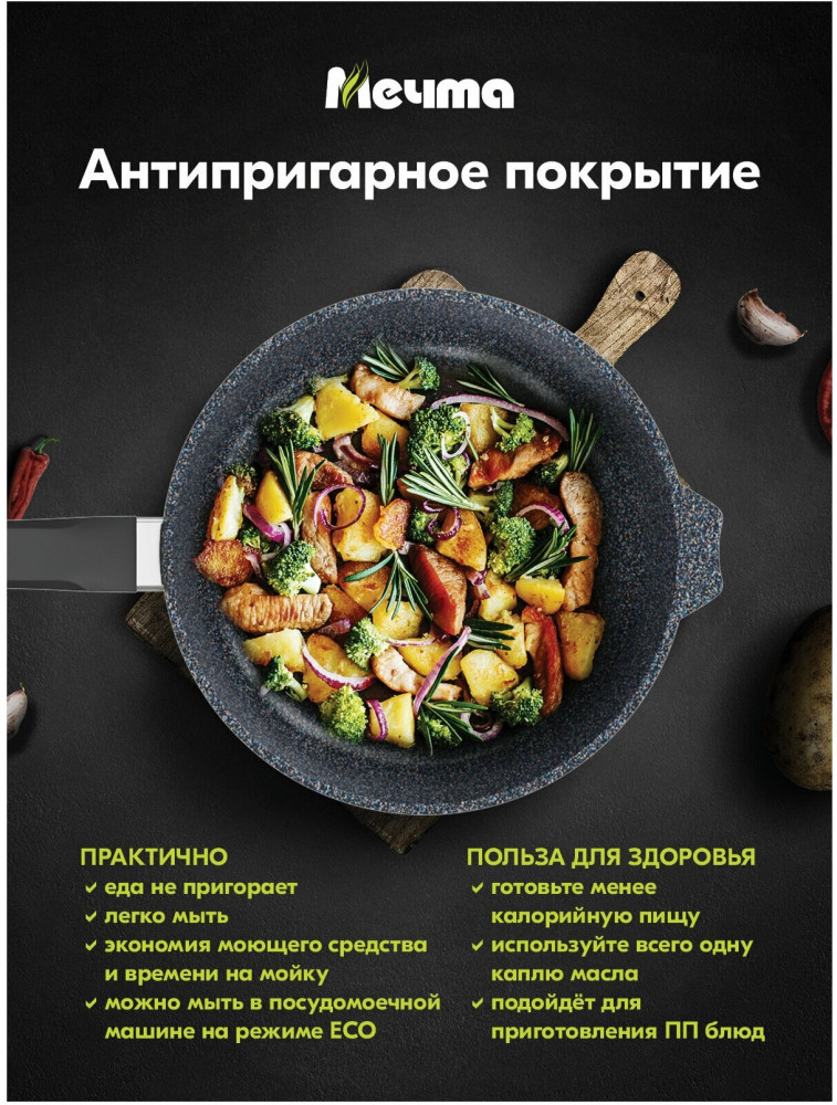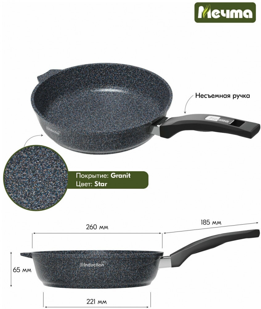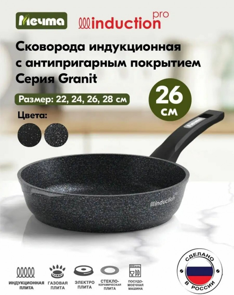 Сковорода индукционная «Мечта» Гранит Star Induction Pro с антипригарным покрытием изготовлена из прочного и легкого сплава пищевого алюминия, который является одним из самых высококачественных и экологических материалов для производства посуды. Сковорода обладает высокой тепловой проводимостью, что обеспечивает равномерный нагрев и эффективное приготовление пищи. Массивное дно с диском из нержавеющей стали и стенки не подвержены деформации, царапинам и сколам благодаря особой технологии производства.