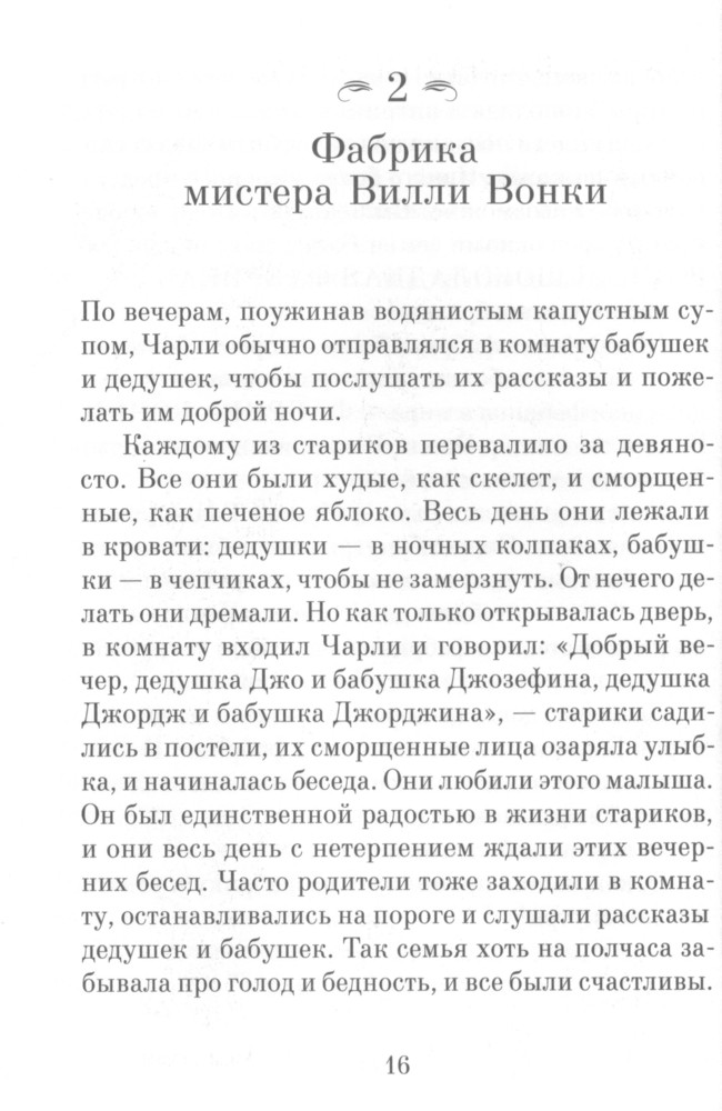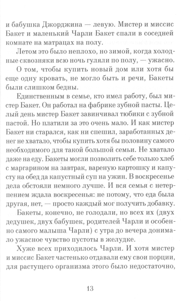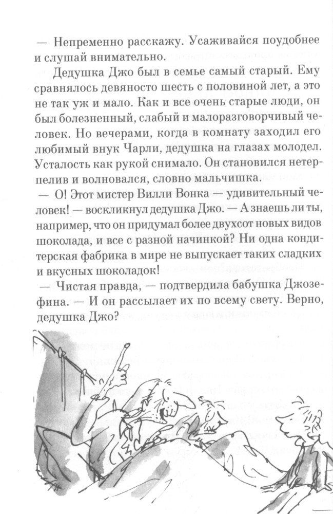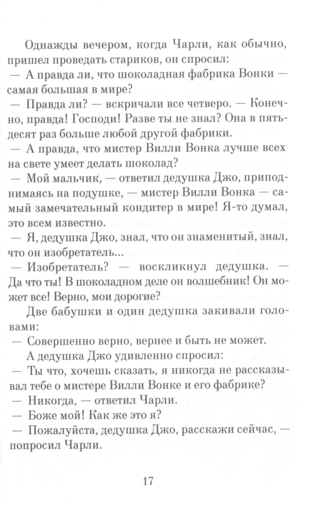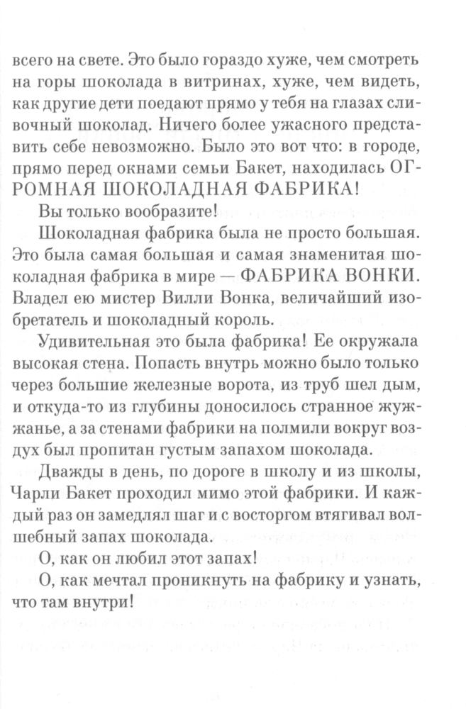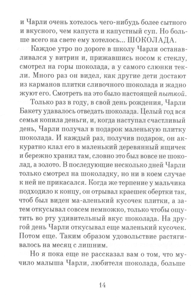 Дети любят и перечитывают. О том, как питаясь одной капустой и живя на одну низкую зарплату, можно сохранить любовь, человеческие, семейные отношения и добрую душу. В фильме Джони Деп изобразил слишком экстравагантного Чарли. В книге он более думающий и теплый. И финал в книге, тоже намного лучше, чем в экранизации. Рекомендую. У нас, наша, уже давно. На этот раз, для племянника заказали.