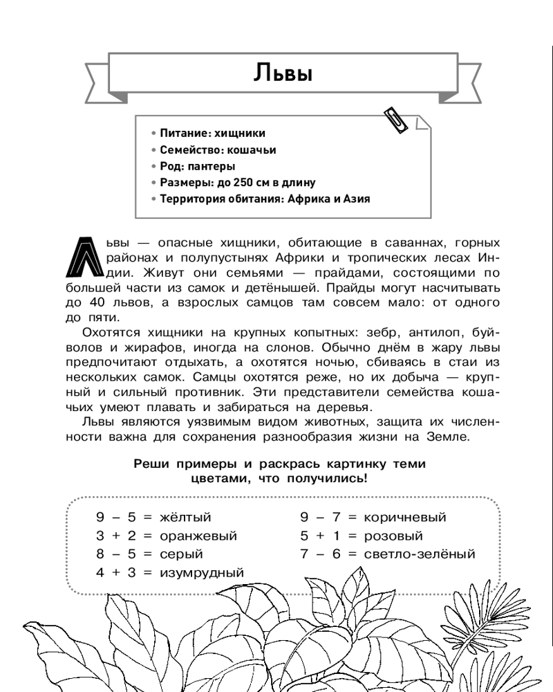 Серия: Умные раскраски Эта книга — не просто раскраска, а самая настоящая маленькая энциклопедия, которая познакомит ребёнка с животными, населяющими нашу планету. Интересные факты о львах и зебрах, броненосцах, ленивцах и жирафах, носорогах и енотах ждут на каждой странице книги. Вы узнаете, каких медведей называют шатунами, быстро ли бегает заяц, умеет ли пятиться кенгуру. Сможете раскрасить подробные иллюстрации животных и попутно потренируете навык устного счёта, ведь на каждом развороте около раскраски есть математические примеры, которые помогут выбрать нужный цвет. |