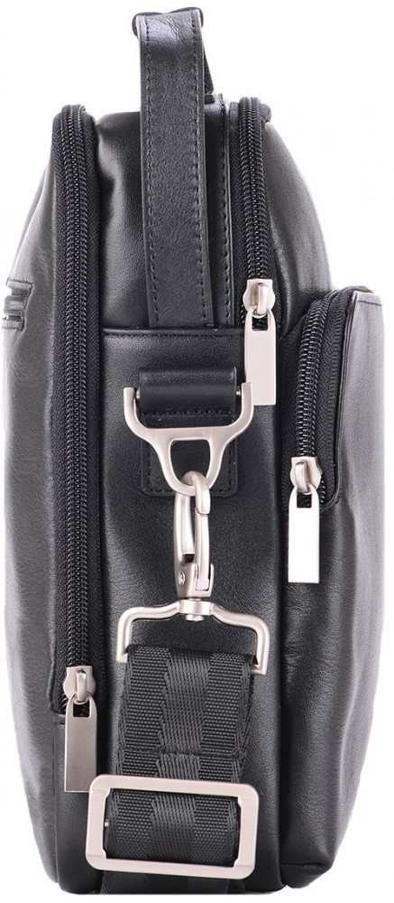 Кожаная мужская сумка среднего размера. Внутри два отдельных отделения на молниях. В одном из которых открытый карман для телефона, во втором закрывающийся на молнию. На задней и передней стенках снаружи так же дополнительные карманы на молниях. Сумка имеет ручку для ношения в руке, а так же наплечный ремень, регулирующийся по длине.