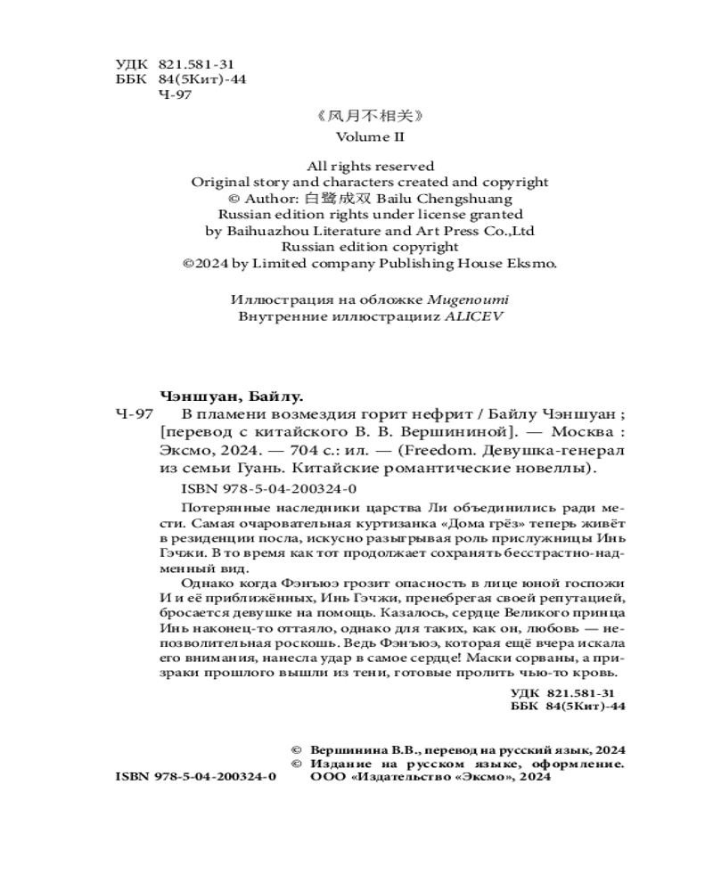 Серия: Freedom. Девушка-генерал из семьи Гуань. Китайские романтические новеллы Необычная китайская новелла «В пламени возмездия горит нефрит» от автора Байлу Чэншуан. На русском языке! Второй том трилогии про девушку-генерала, некогда выдающую себя за куртизанку, а теперь живущую в резиденции посла. |