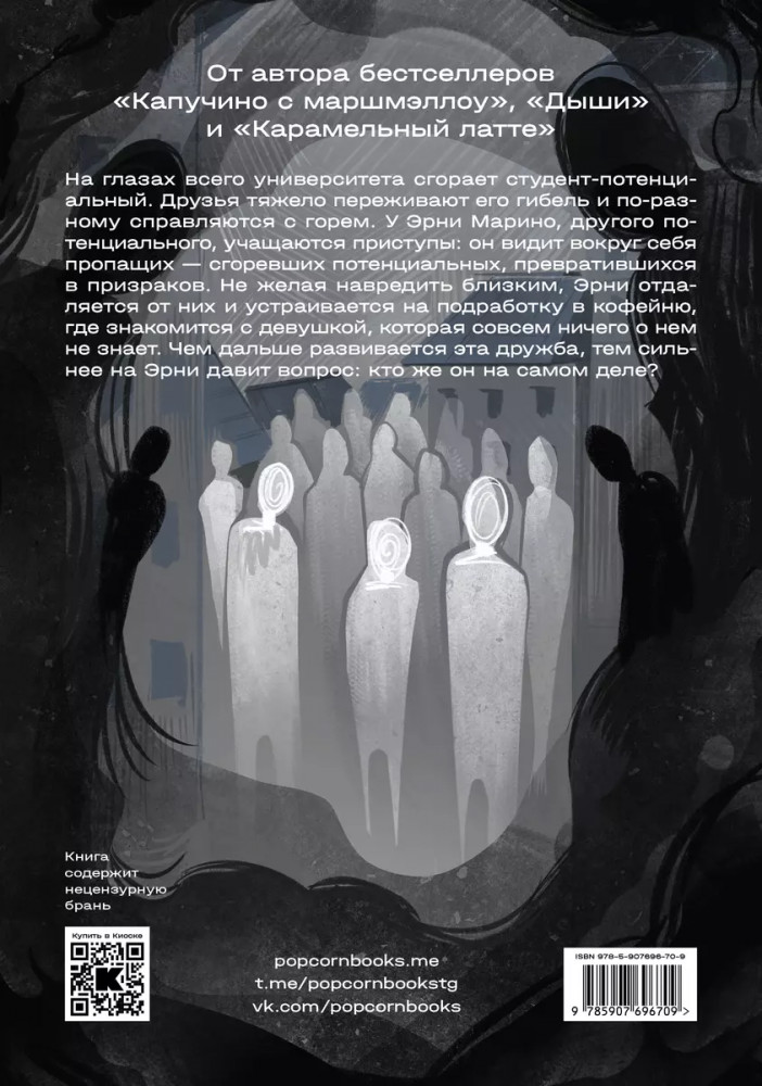 На глазах всего университета сгорает студент-потенциальный. Друзья тяжело переживают его гибель и по-разному справляются с горем. У Эрни Марино, другого потенциального, учащаются приступы: он видит вокруг себя пропащих — сгоревших потенциальных, превратившихся в призраков. Не желая навредить близким, Эрни отдаляется от них и устраивается на подработку в кофейню, где знакомится с девушкой, которая совсем ничего о нем не знает. Чем дальше развивается эта дружба, тем сильнее на Эрни давит вопрос: кто же он на самом деле? |